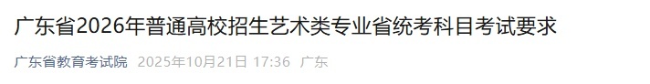 为做好我省2026年普通高校艺术类专业考试招生工作,根据相关文件精神,结合教育部教育考试院相关要求和我省实际,我院对部分科目考试要求作了进一步明确。《广东省2026年普通高校招生艺术类专业省统考科目考试要求》详见附件。