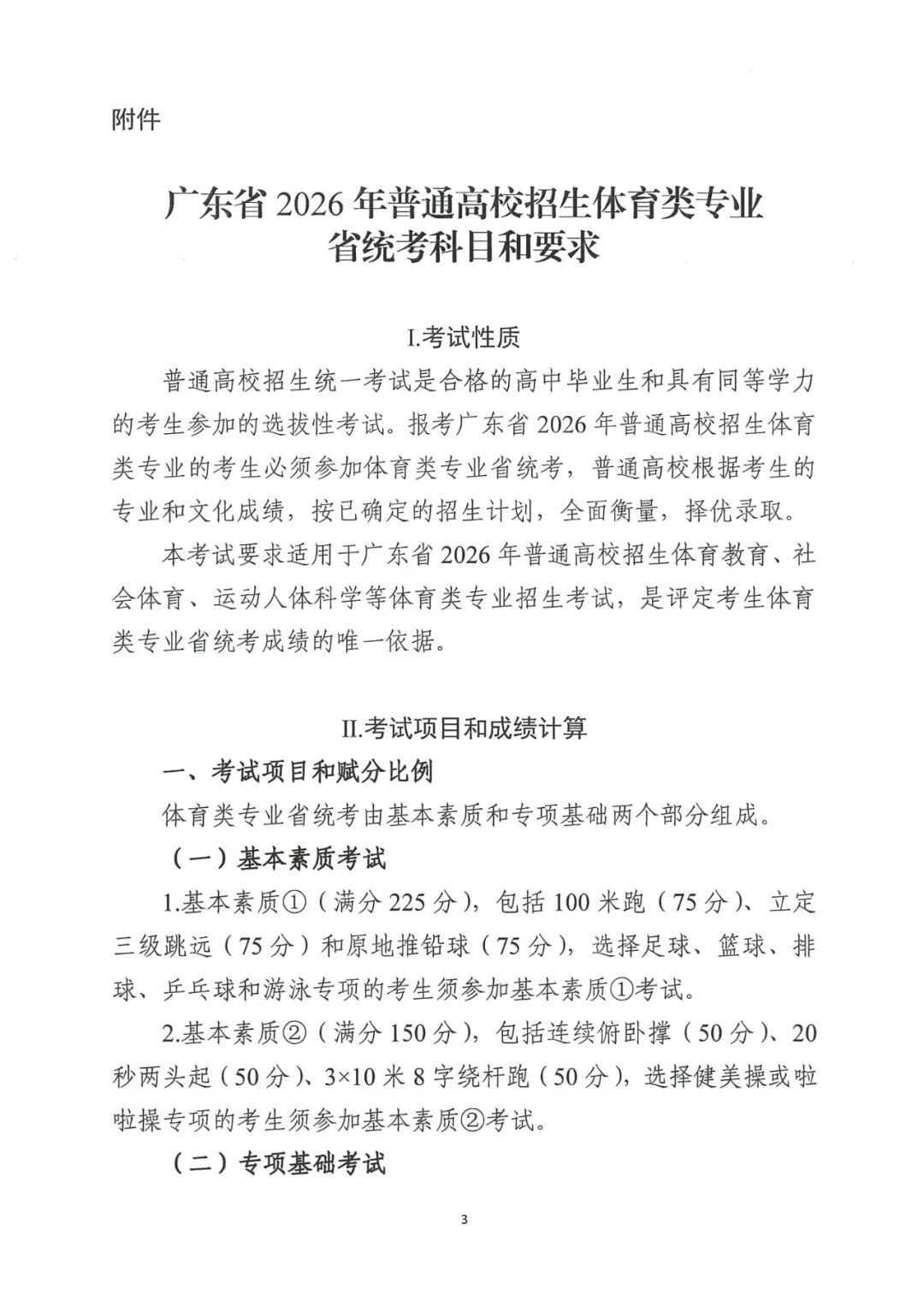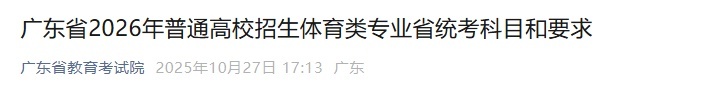 日前,《广东省2026年普通高校招生体育类专业省统考科目和要求》(见附件)印发,我省2026年普通高校招生体育类专业省统考照此执行。具体考试时间和地点另文通知。