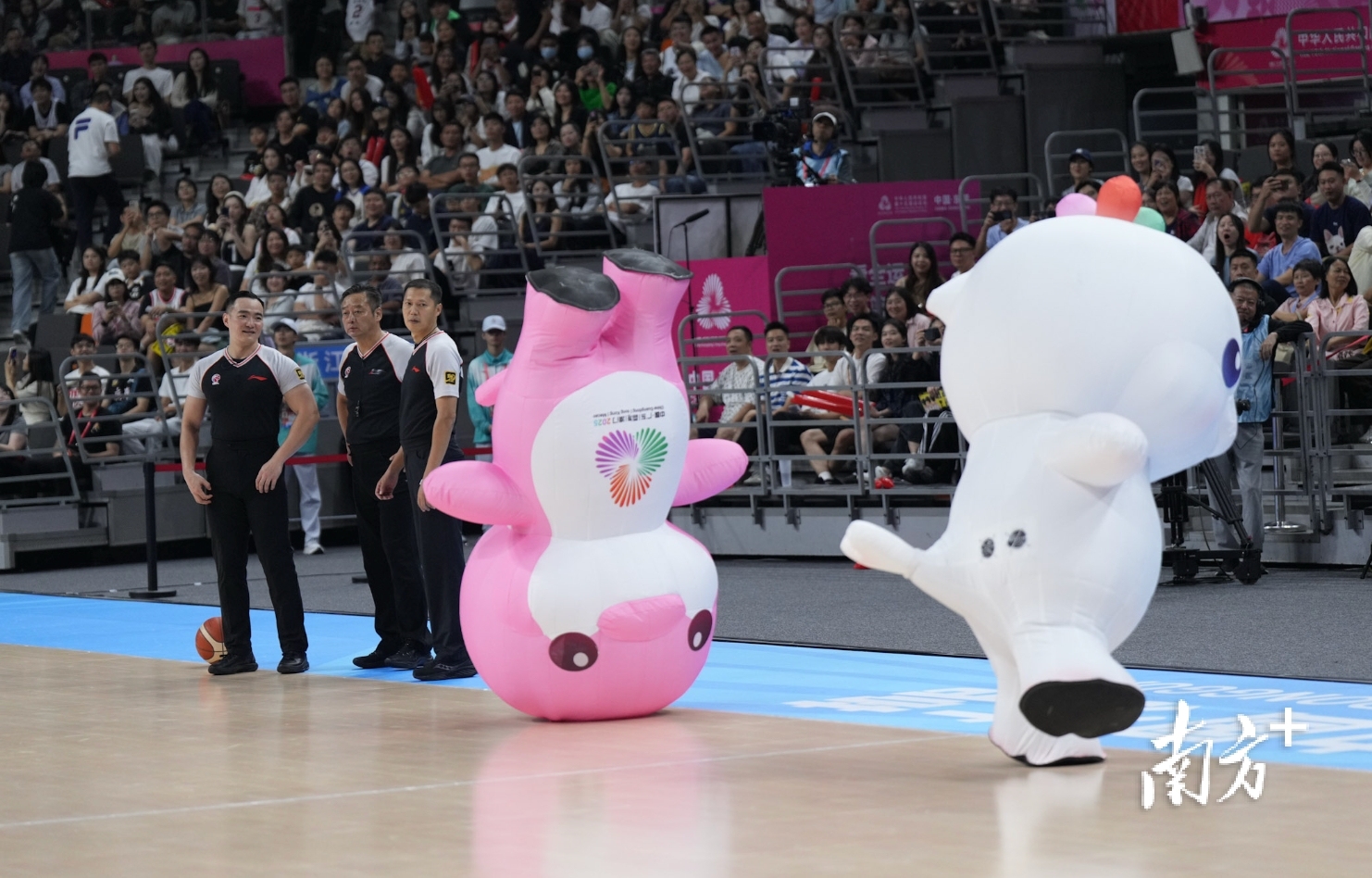 十五运会男篮成年组现场,吉祥物“喜洋洋”“乐融融”表演倒立“绝活”。