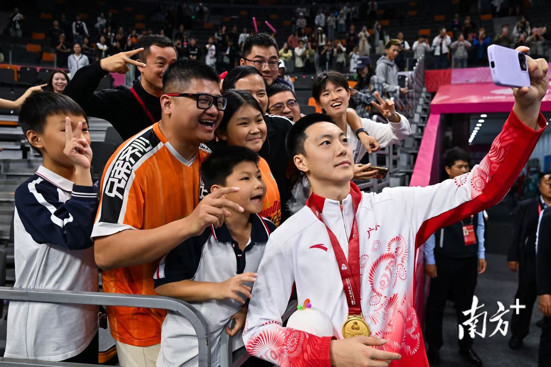 广东队夺冠后,胡明轩与球迷们合影留念。