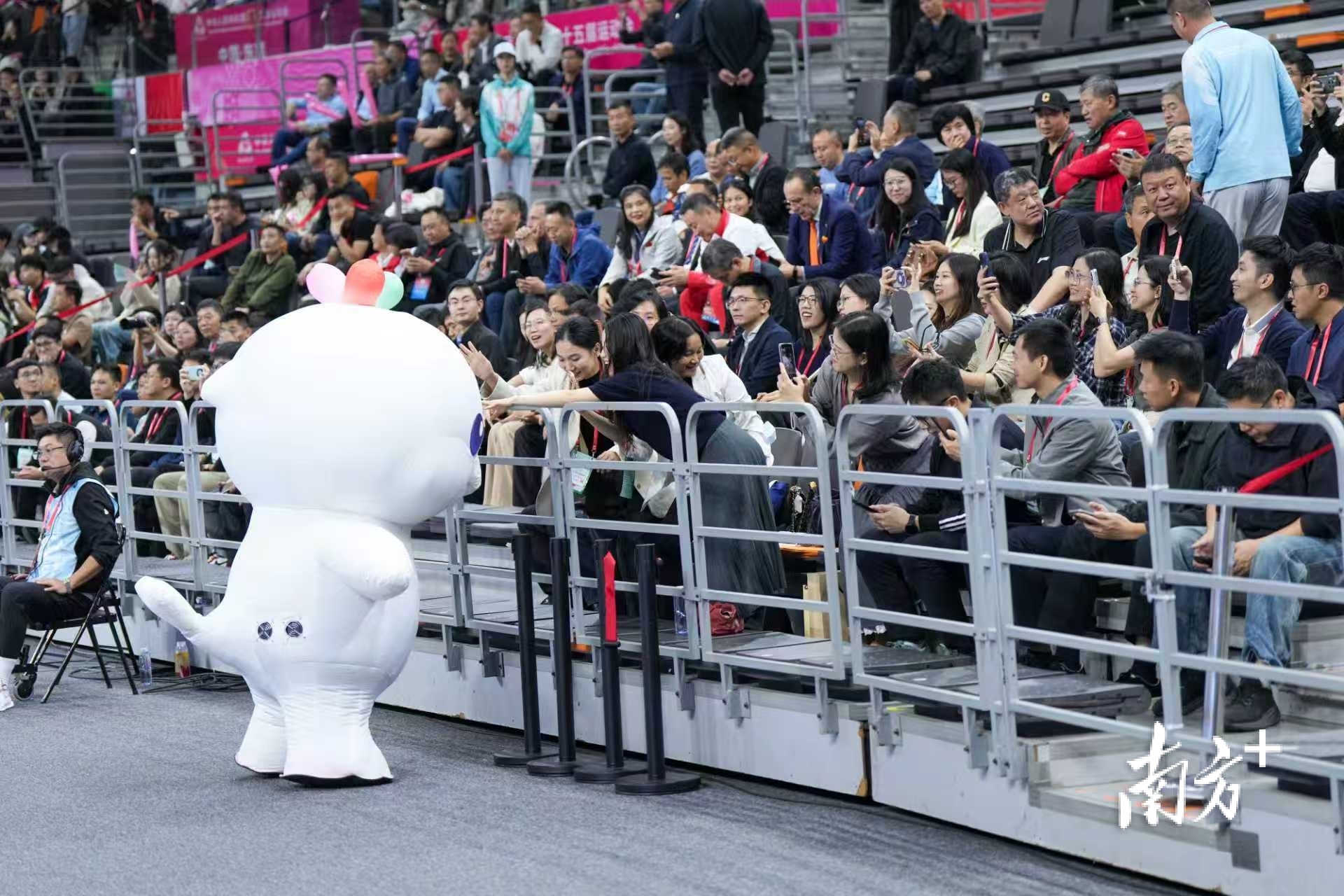 十五运会男篮成年组现场,吉祥物“喜洋洋”与观众互动。