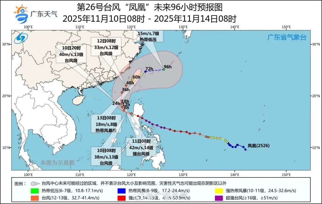 预计,“凤凰”将以每小时10—15公里的速度向西北方向移动,将于今天中午前后移入南海中东部海面,强度将逐渐增强,最大强度可达强台风级(14级),11日夜间逐渐转向东北方向移动,强度逐渐减弱,并将于12日下午到晚上在台湾岛西南部沿海再次登陆。