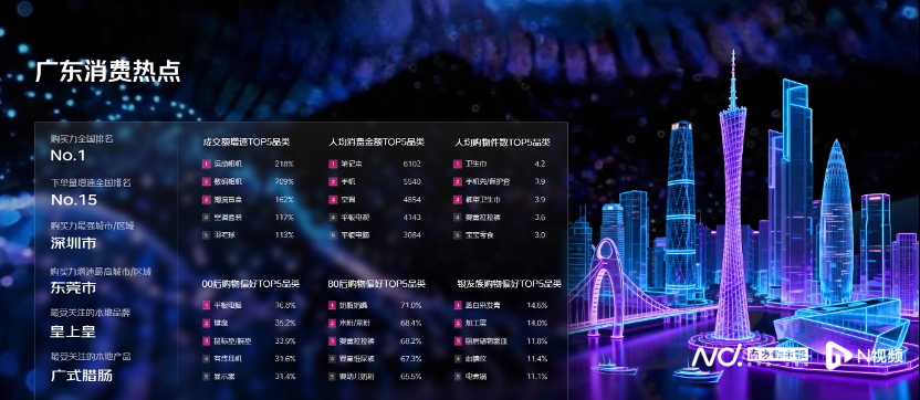 按区域来看,京东11.11消费情况显示,广东省在此次大促期间购买力排名第一,稳坐全国消费C位。在广东省内,深圳市是购买力最强的城市,东莞市的购买力增速最高。知名的“广字头”品牌众多,“皇上皇”是最受关注的本地品牌,“广式腊肠”是最受关注的本地产品。