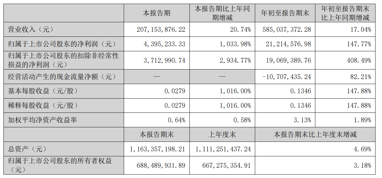单季度维度,第三季度成为业绩增长的重要推手。报告期内,公司单季营收2.07亿元,同比增长20.74%,增速较前三季度整体水平提升3.7个百分点;归母净利润439.52万元,同比激增1033.98%,超10倍的同比增幅,凸显出公司三季度经营效率的显著提升。