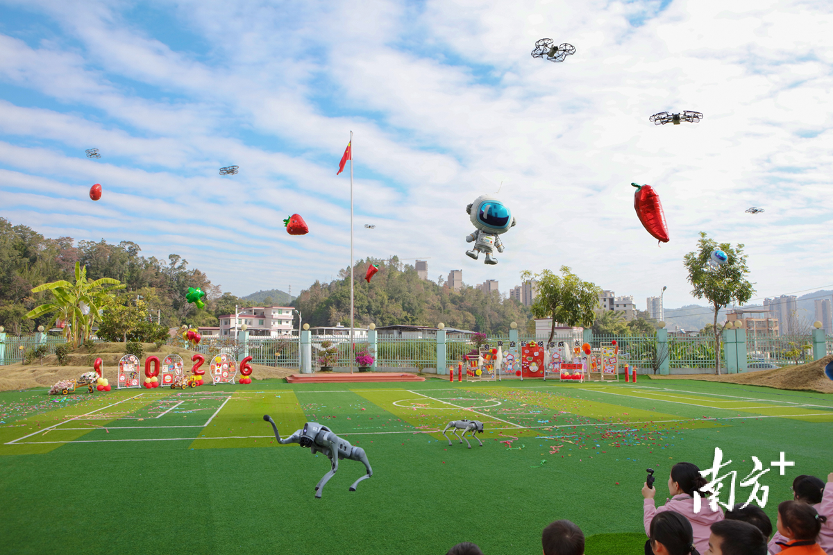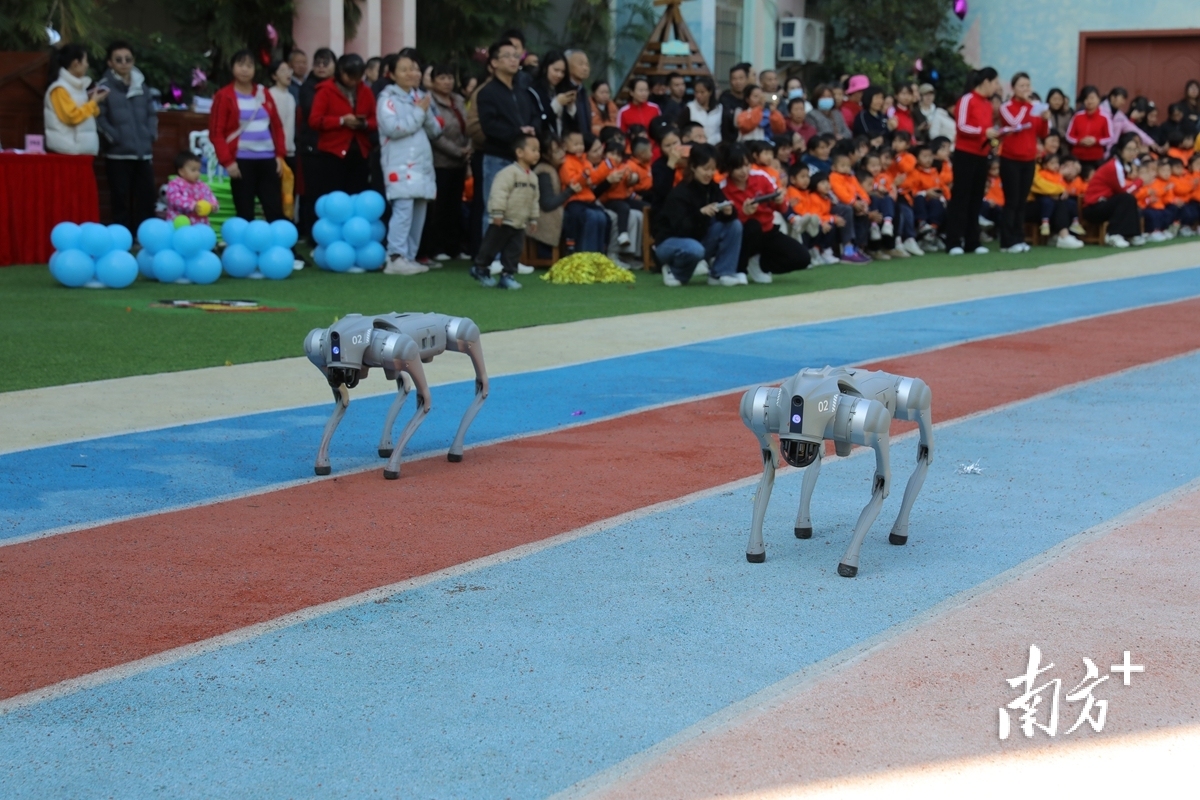 机器狗与无人机在操场上为孩子们献上表演。