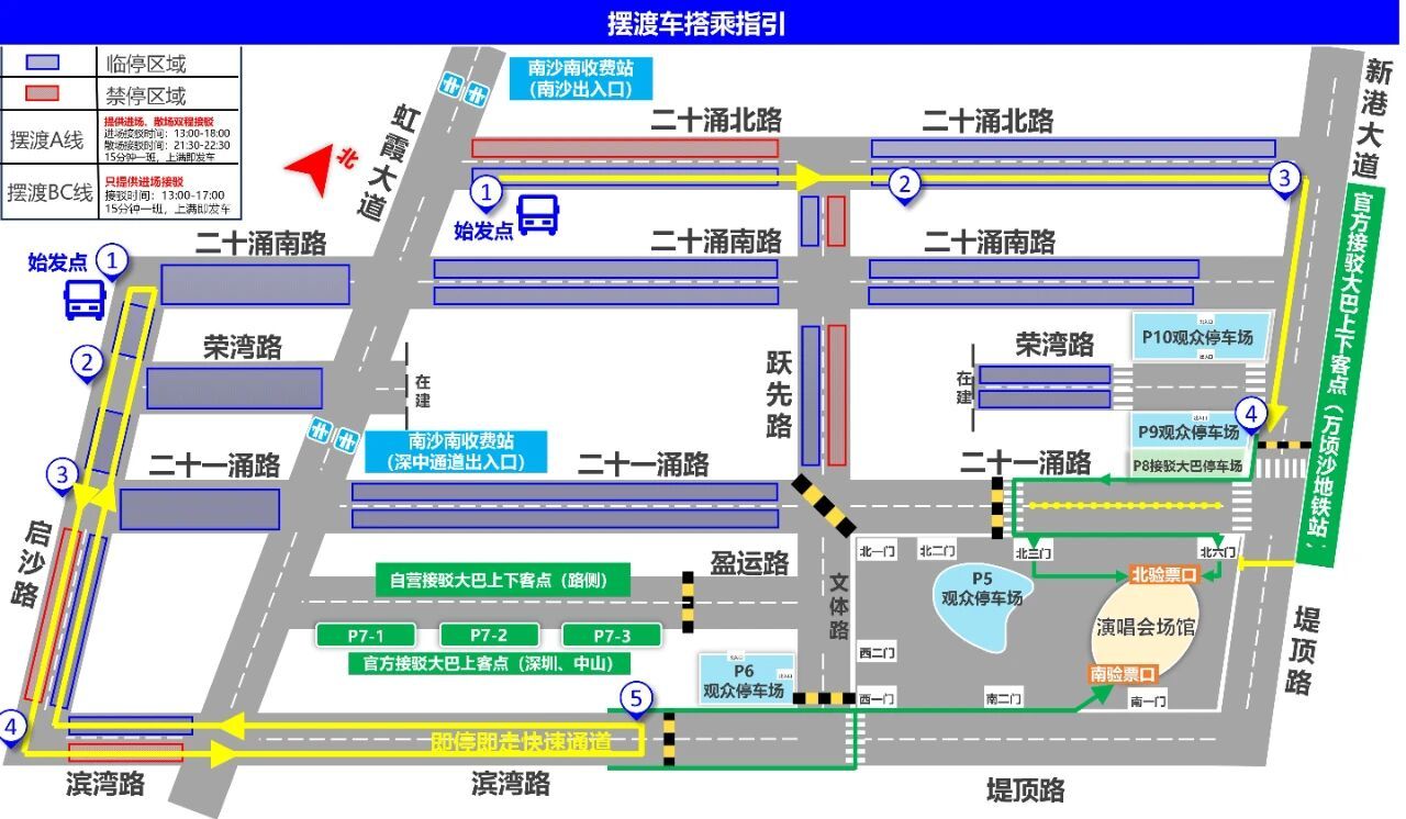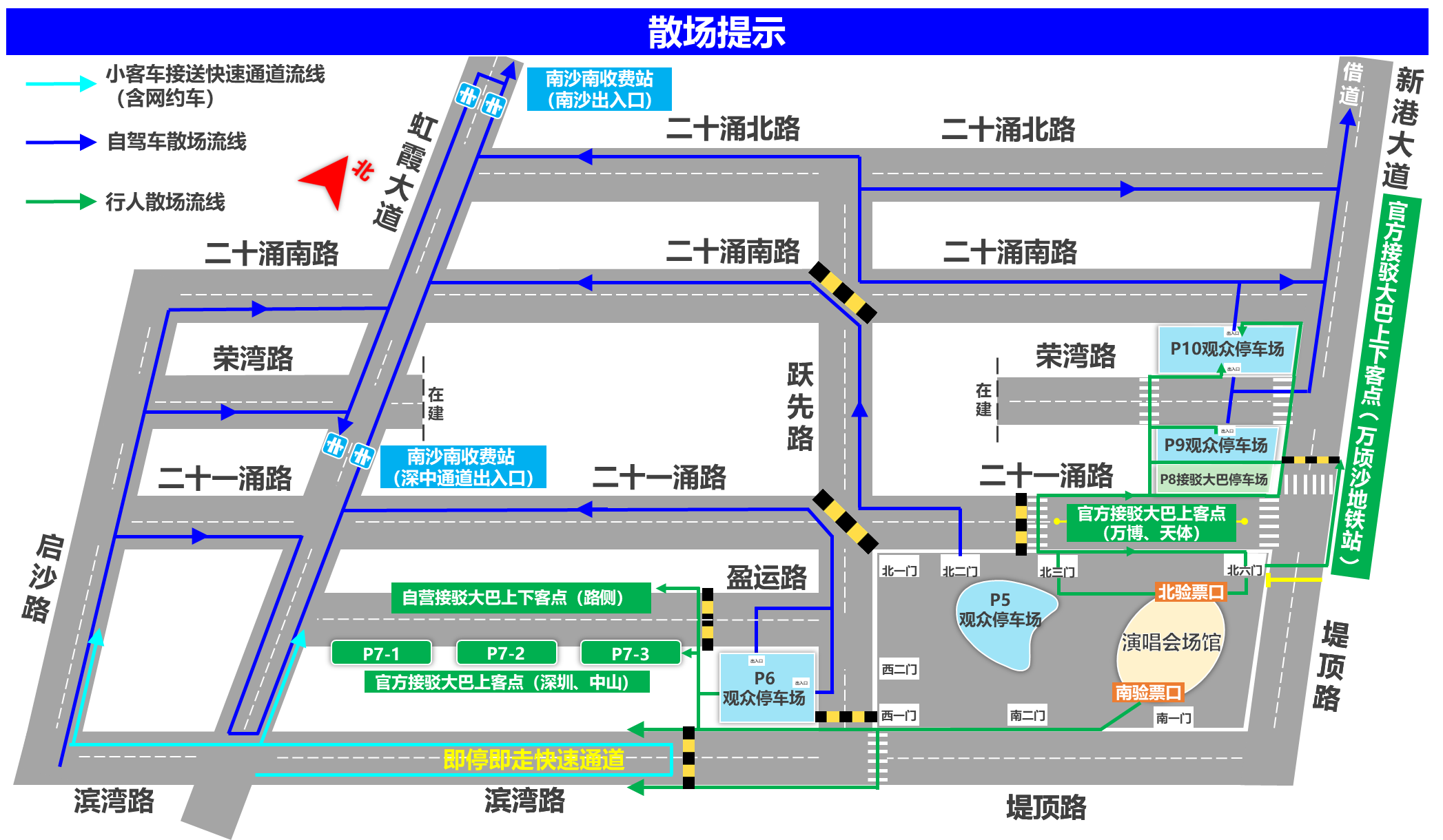 接送车辆(含网约车):需经启沙路进入滨湾路“快速接送通道”,观众下车后步行至南检票口;滨湾路(虹霞大道至文体路)为严管路段,禁止停车,接送车辆需即停即走,违者将被拖移。