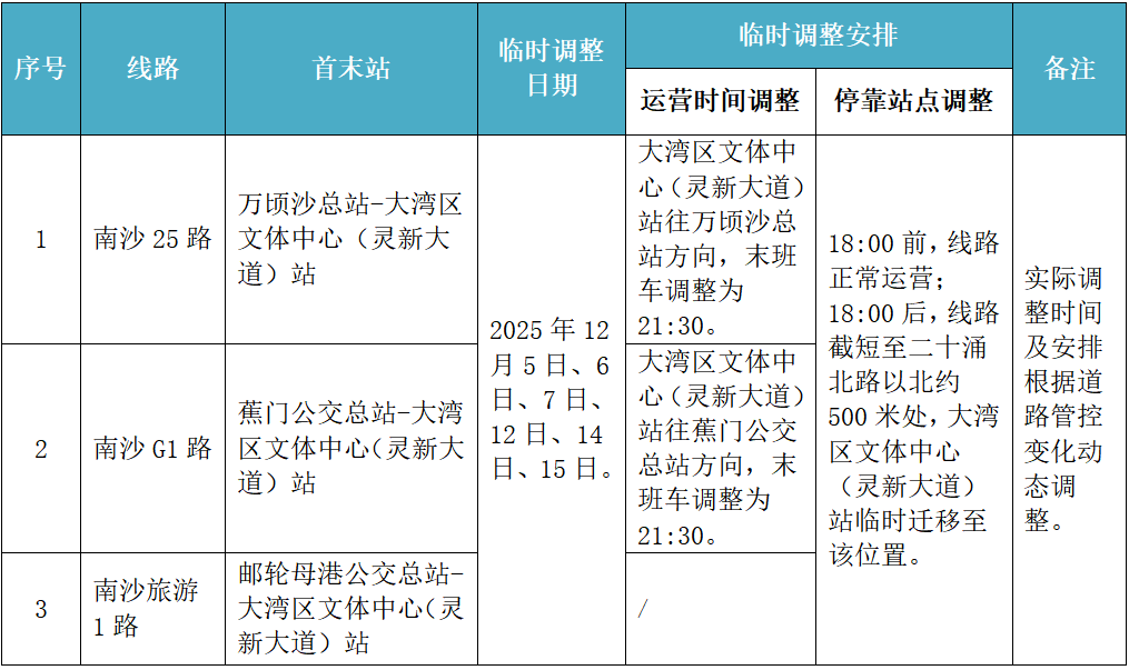 地铁接驳:从北验票口经北六门至新港大道,搭乘接驳公交前往万顷沙地铁站;演出日当天,地铁18号线万顷沙站往冼村方向运营服务时间将延长1小时至当日23:30,在延长运营服务时间期间,加开的列车执行快车模式,(停靠万顷沙、横沥、番禺广场、南村万博、磨碟沙,终点站为冼村);最后1列列车终点站为番禺广场(停靠万顷沙、横沥、番禺广场)。延长期间除万顷沙站外,其他各站只出不进。