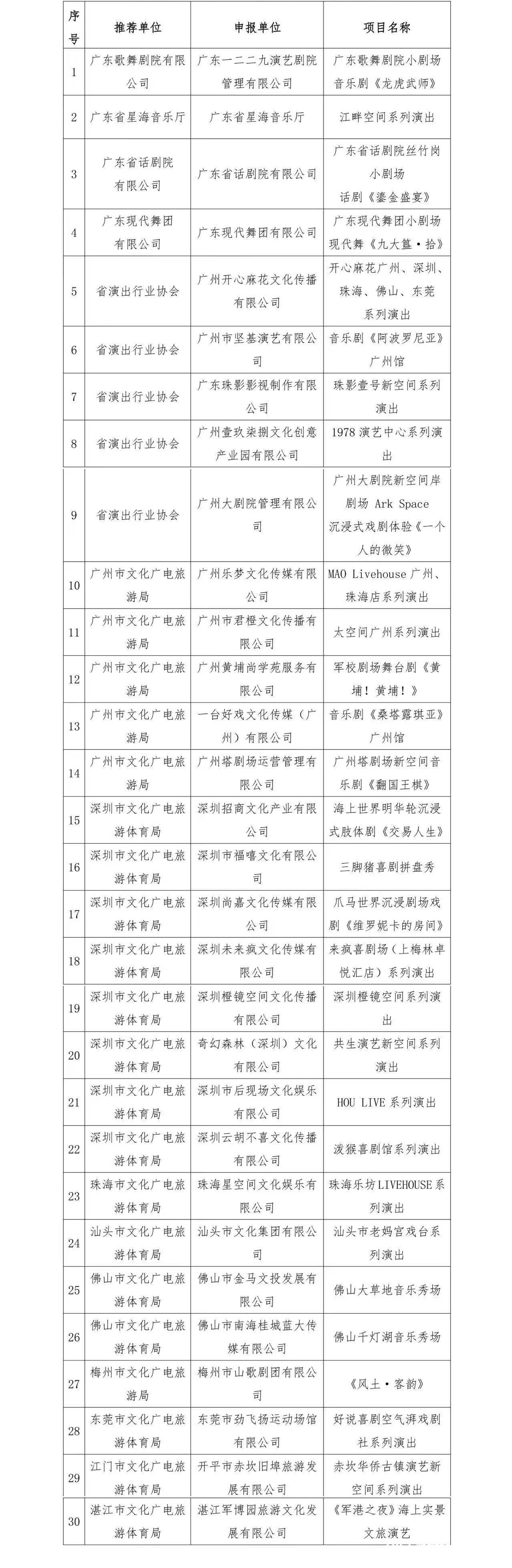 同时,经单位申报、组织推荐、集体评议,综合考虑各申报项目的市场定位、演出规模、内容形式、艺术水准、演艺创新以及与项目周边住宿餐饮、休闲运动、商贸文创等融合程度和消费拉动力度,活动遴选出30个演艺新空间项目纳入此次活动。