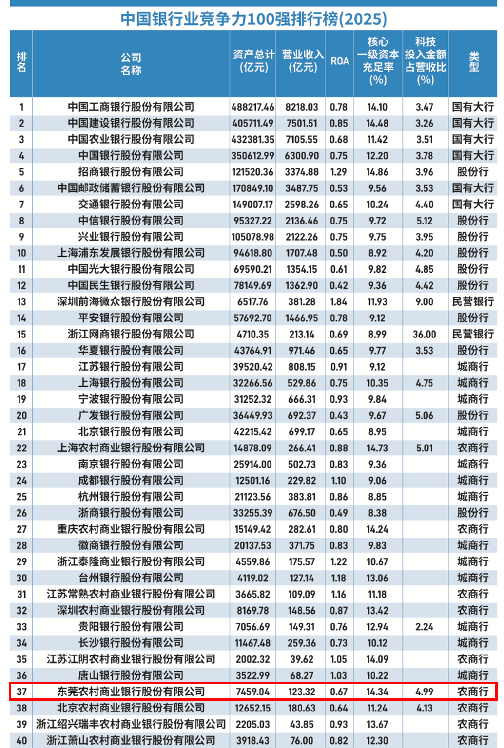 近日,“中国银行业竞争力100强榜单”发布,东莞农村商业银行(下称“东莞农商银行”)凭稳健经营、持续创新和强劲潜力,跃居第37位,较2024年飙升6位。
