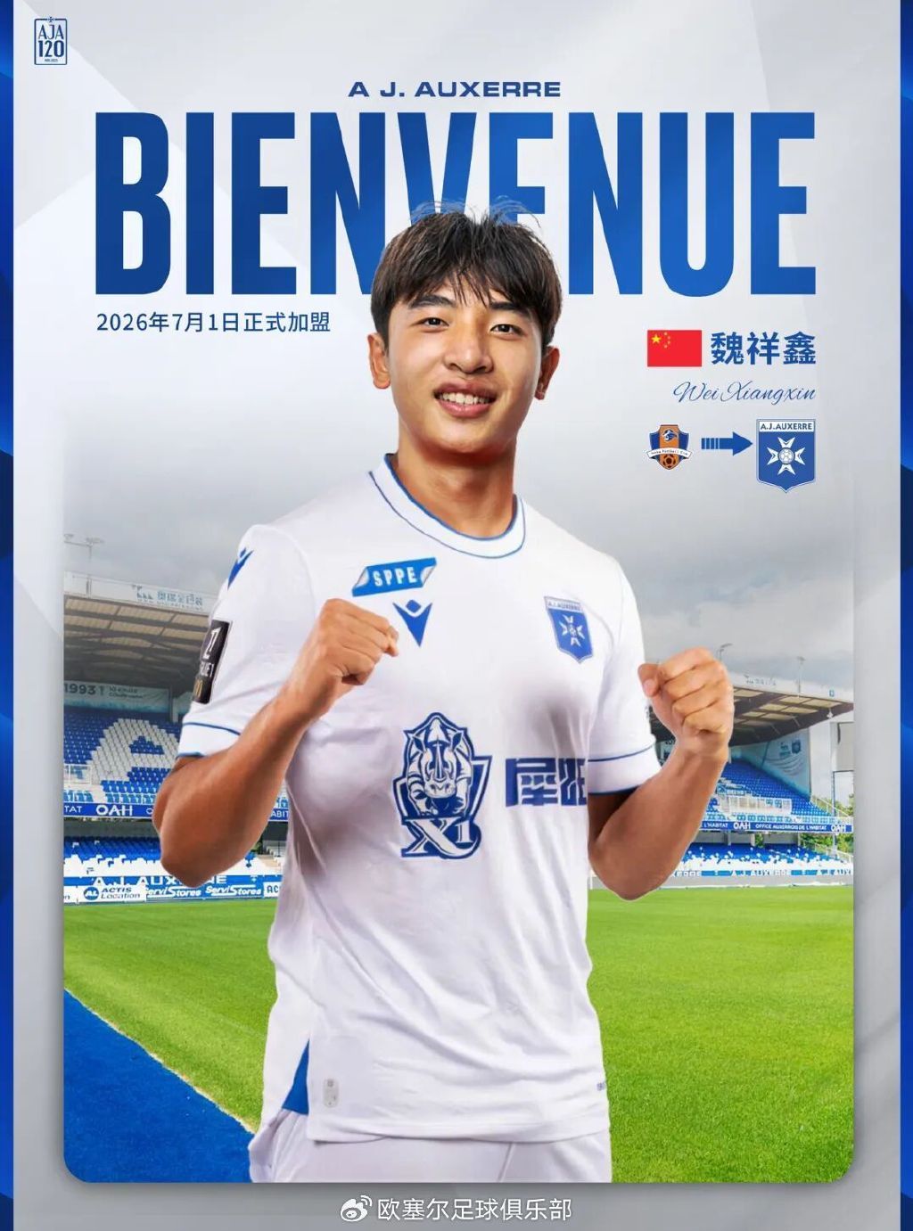 法国足球甲级联赛的欧塞尔足球俱乐部今日正式宣布,已与梅州客家足球俱乐部达成转会协议,中国新星魏祥鑫将在年满18岁后签订其个人合同,并于2026年7月1日起正式加盟球队。