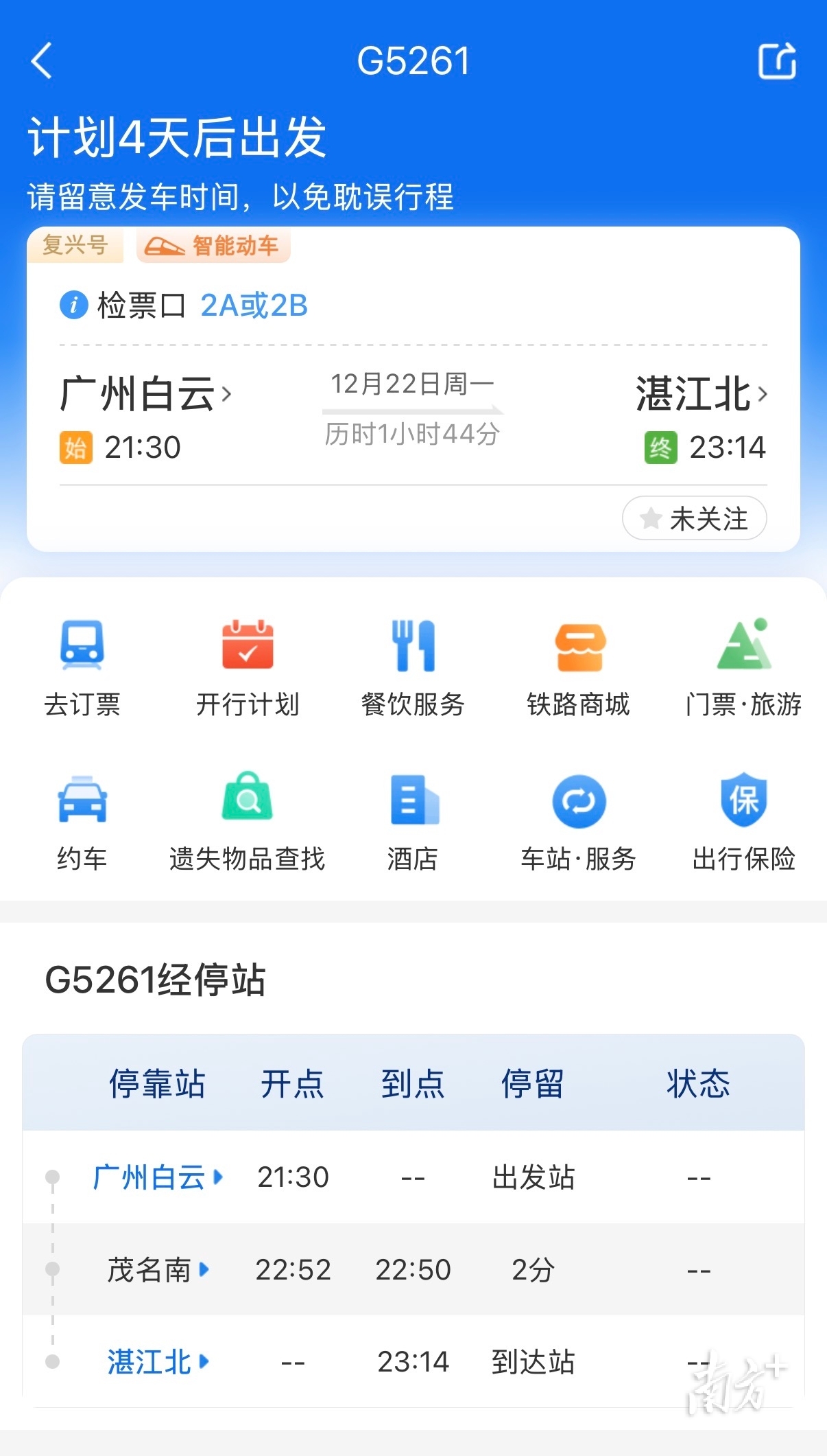 南方+18日晚通过铁路12306查询,时刻表已经录入茂名南站,并同步录入了10趟列车组,最快车次一趟G5261从广州白云站发车,中途不停靠站点,直达茂名南站,用时1小时20分。具体票价官方还没能查询。