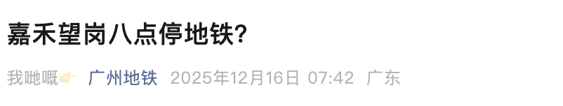 刚刚(12月16日),广州地铁发文回应网传嘉禾望岗晚上8点地铁就停了。