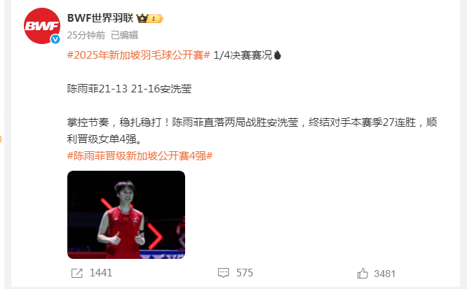 5月30日在2025年新加坡羽毛球公开赛女单四分之一决赛中陈雨菲以21-13、21-16战胜世界排名第一的安洗莹晋级女单四强赛后,陈雨菲表示能赢下安洗莹对自己对整个中国女单都是强心剂恭喜陈雨菲继续加油! 编辑 傅倩影 订阅后可查看全文(剩余80%)