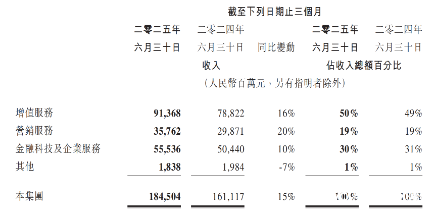 AI驱动的财务增长不只体现在To B板块(金融科技及企业服务)。财报显示,营销服务业务第二季的收入同比增长20%至人民币358亿元,主要得益于AI驱动的广告平台改进及微信交易生态的提升,推动了广告主对视频号、小程序及微信搜一搜的强劲需求,第二季度主要行业的营销服务收入均有所增长。