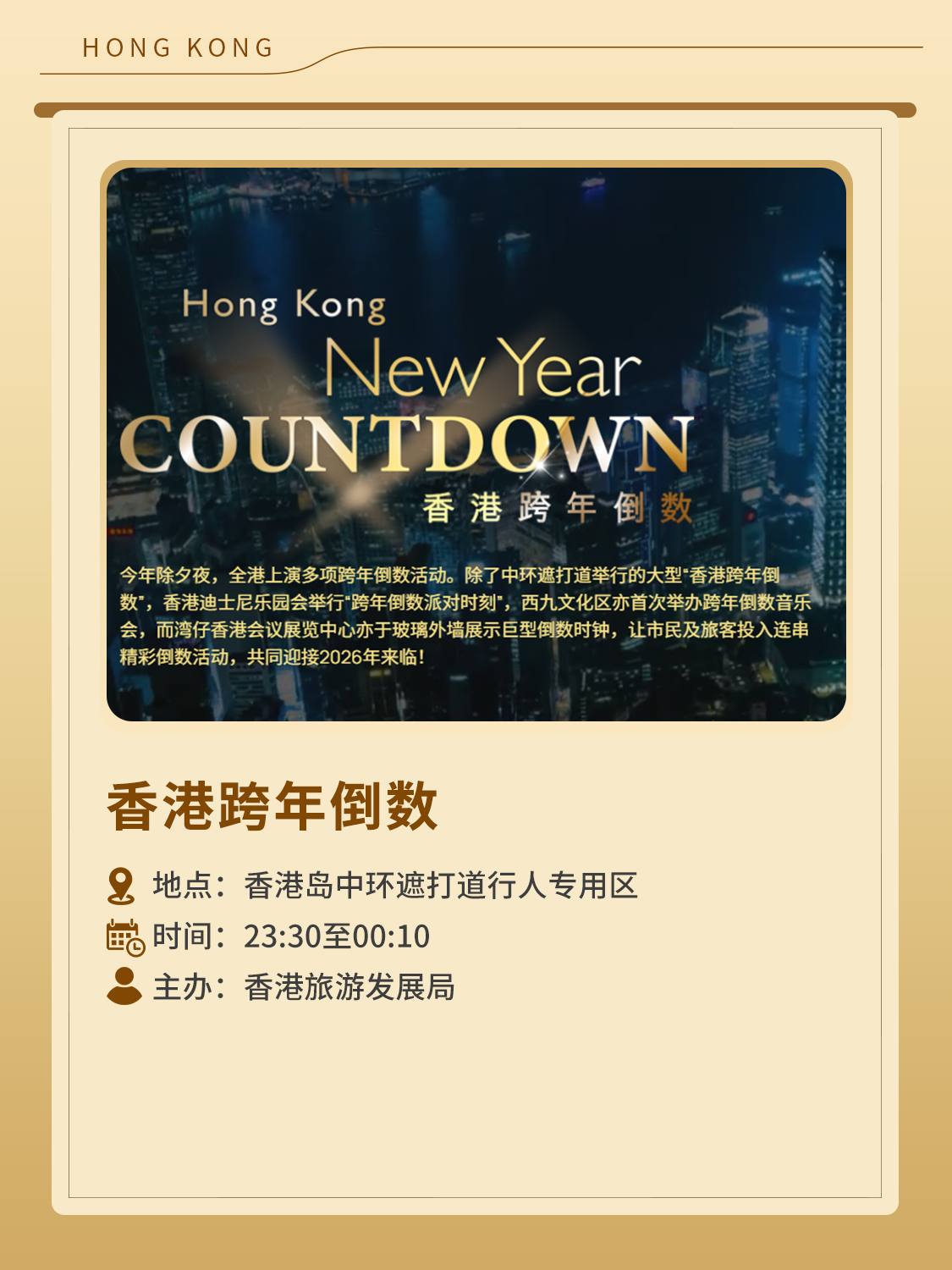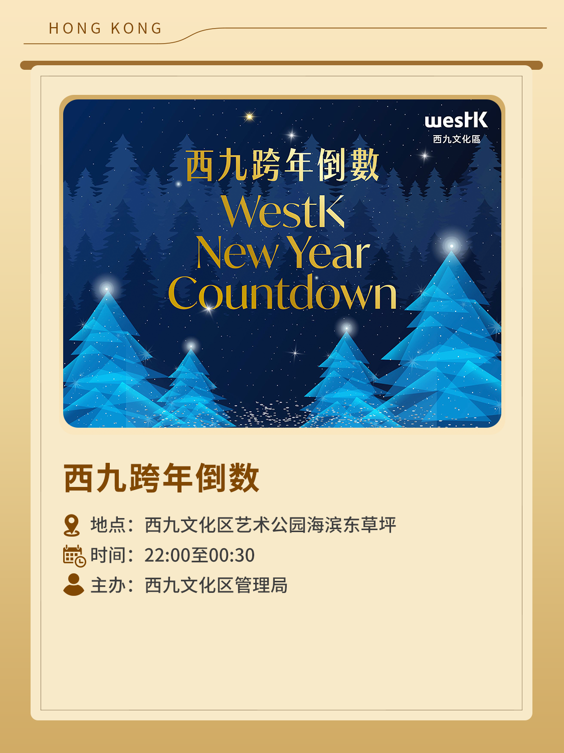 除了中环遮打道举行的大型“香港跨年倒数”、香港迪士尼乐园会举行“跨年倒数派对时刻”,西九文化区亦首次举办跨年倒数音乐会,让市民及旅客投入连串精彩倒数活动,共同迎接2026年来临!