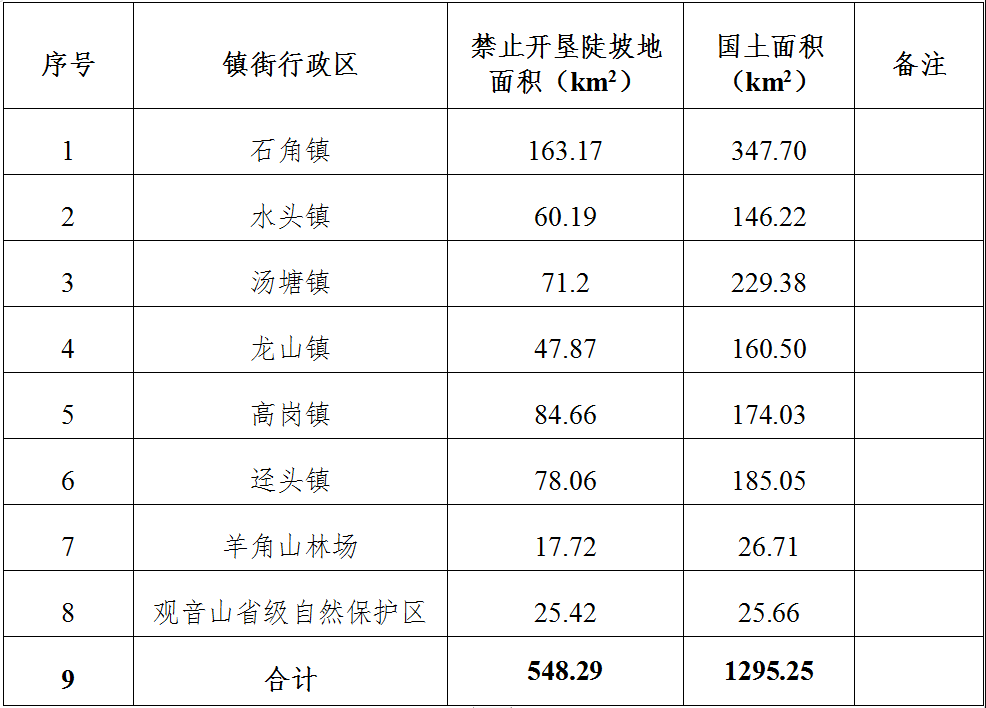 一、全县禁止开垦陡坡地范围划定面积548.29平方公里,在全县各镇均有分布,具体分布范围和面积见附件。
