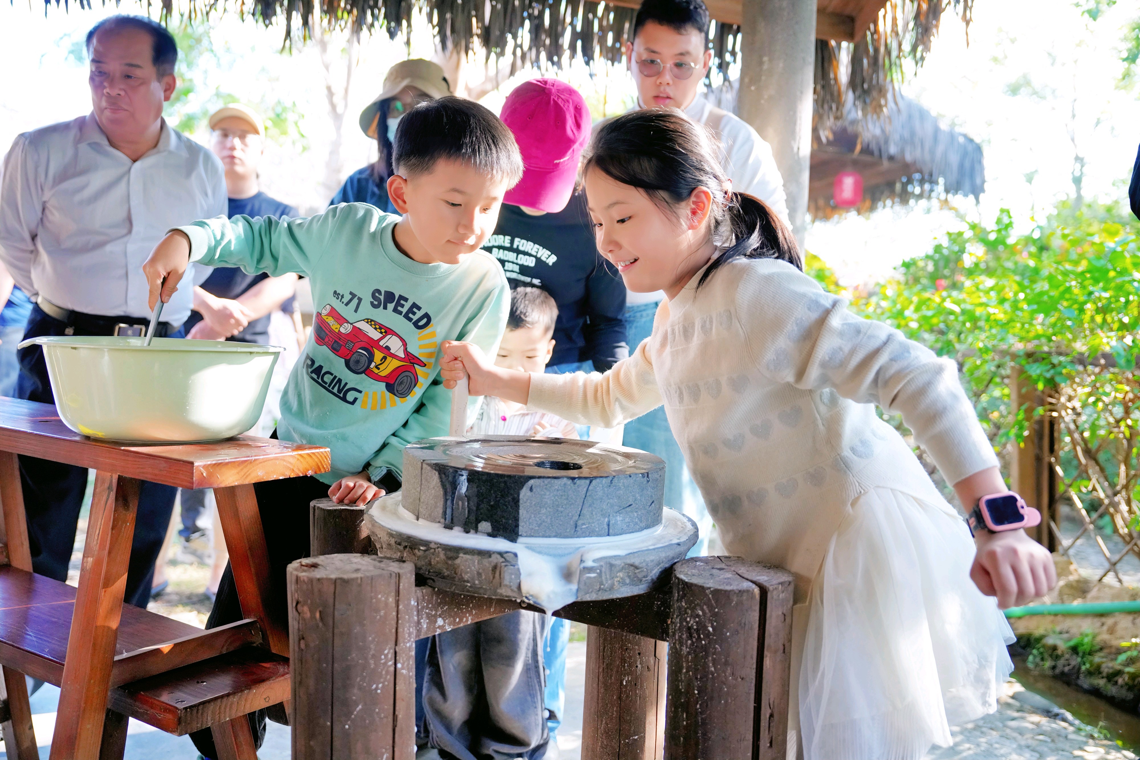 天子山农业公园优美的自然风光和古犁耙、风谷车等传统农具激发了车友们的浓厚兴趣,他们纷纷拿起相机拍照留念,还上手体验水磨豆浆,感受农耕文化的魅力。在工作人员的指导下,车友们亲手转动石磨,看着豆粒渐渐化作乳白的浆汁,现场洋溢着欢声笑语。“没想到磨豆浆这么有趣,喝上自己亲手磨出来的豆浆,感觉格外香甜!”一位车友捧着刚煮好的豆浆笑着说。车友们还走进田间地头,体验采摘乐趣,进一步感受深汕乡村振兴的鲜活成果。