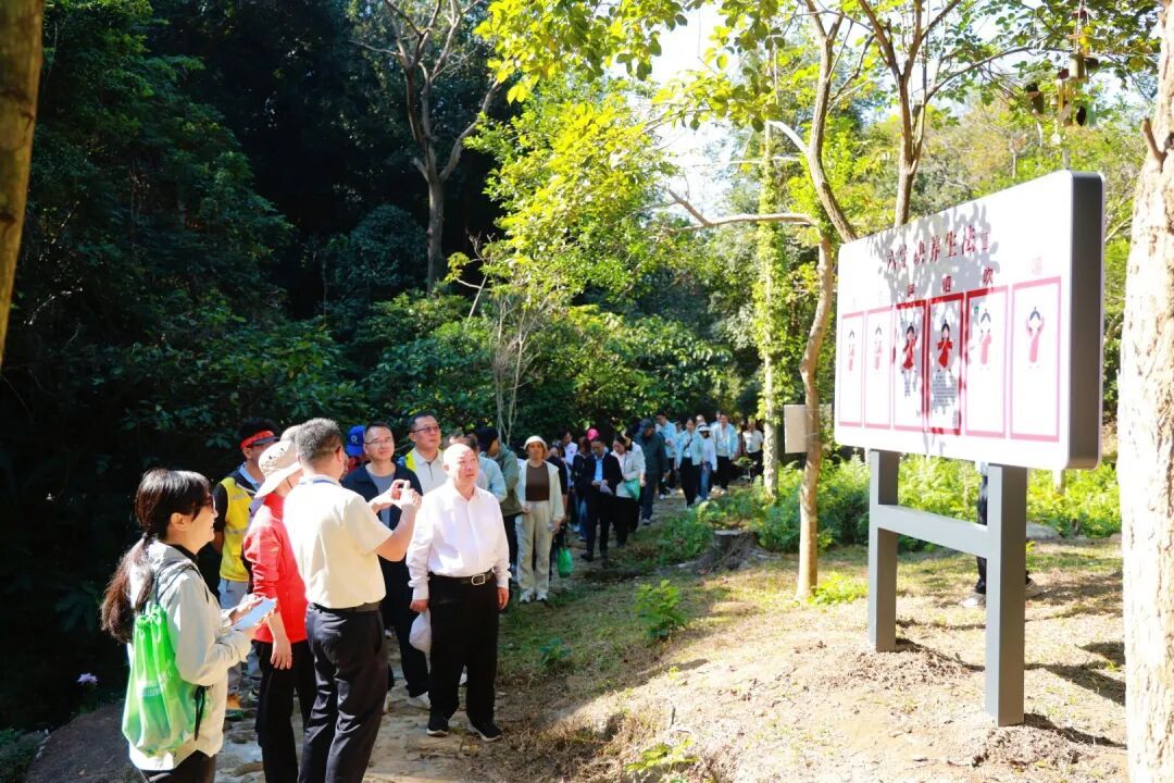 康养径科学划分五大功能区域:太极八段锦习练区、芳香疗愈区、森林冥想区、石斛种植区、科普介绍区。徒步途中,参与者穿行于山林溪涧之间,葱郁绿植环绕身旁,空气中弥漫的植物挥发性芳香物质,既能提神醒脑,又能缓解疲劳。大家沿途欣赏自然风光,感受高负氧离子环境的清新滋养,不少人驻足打卡留念,尽情享受“在自然中行走、在行走中疗愈”的惬意。路线沿途还设置了森林秋千、露营休憩营地等便民设施,同步布设康养知识介绍牌、六字呼吸诀等科普内容,让市民在休闲游览中轻松收获健康知识。