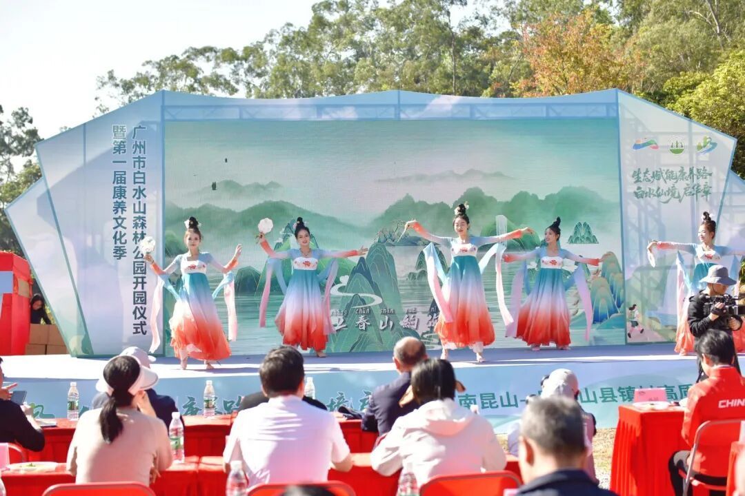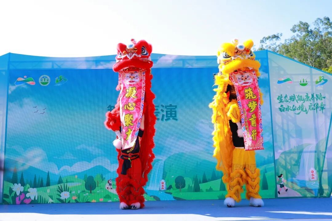 仪式伊始,活力四射的舞狮表演点燃全场热情。舞蹈《上春山》以跃动节奏展现自然生机,歌曲《你来了》用温暖旋律传递白水山的迎宾之喜。现场播放的12公里康养径宣传片,全方位展现了这条入选首批20条“迎全运・森呼吸”羊城绿色康养径的独特魅力——路线从西门广场延伸至榕荫广场,串联起登山步道、观瀑台等核心节点,蕴含“心动”“心安”“心成”的人生寓意。广州市增城林场管理中心、广州市林业和园林局相关领导先后致辞,介绍公园建设历程与发展愿景,展望生态康养产业发展新蓝图。