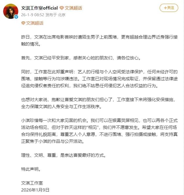 也想对大家说,抱歉让喜爱文淇的朋友们担心了,工作室接下来将强化安保措施,全力保障文淇的人身安全与工作生活秩序。
