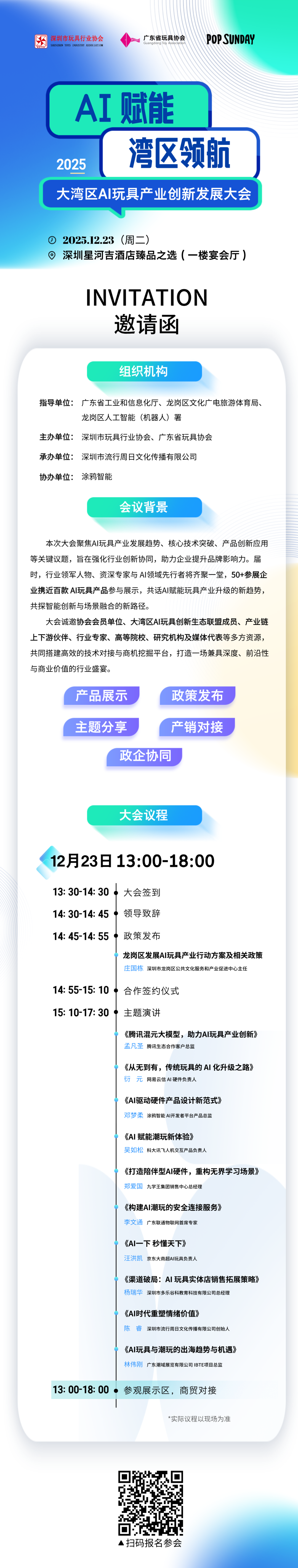本次大会由广东省工业和信息化厅、深圳市龙岗区文化广电旅游体育局、深圳市龙岗区人工智能(机器人)署指导,广东省玩具协会、深圳市玩具行业协会主办,深圳市流行周日文化传播有限公司承办,涂鸦智能协办—— 政企协三方联动,资源浓度直接拉满!