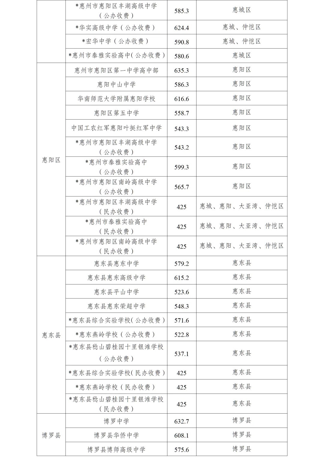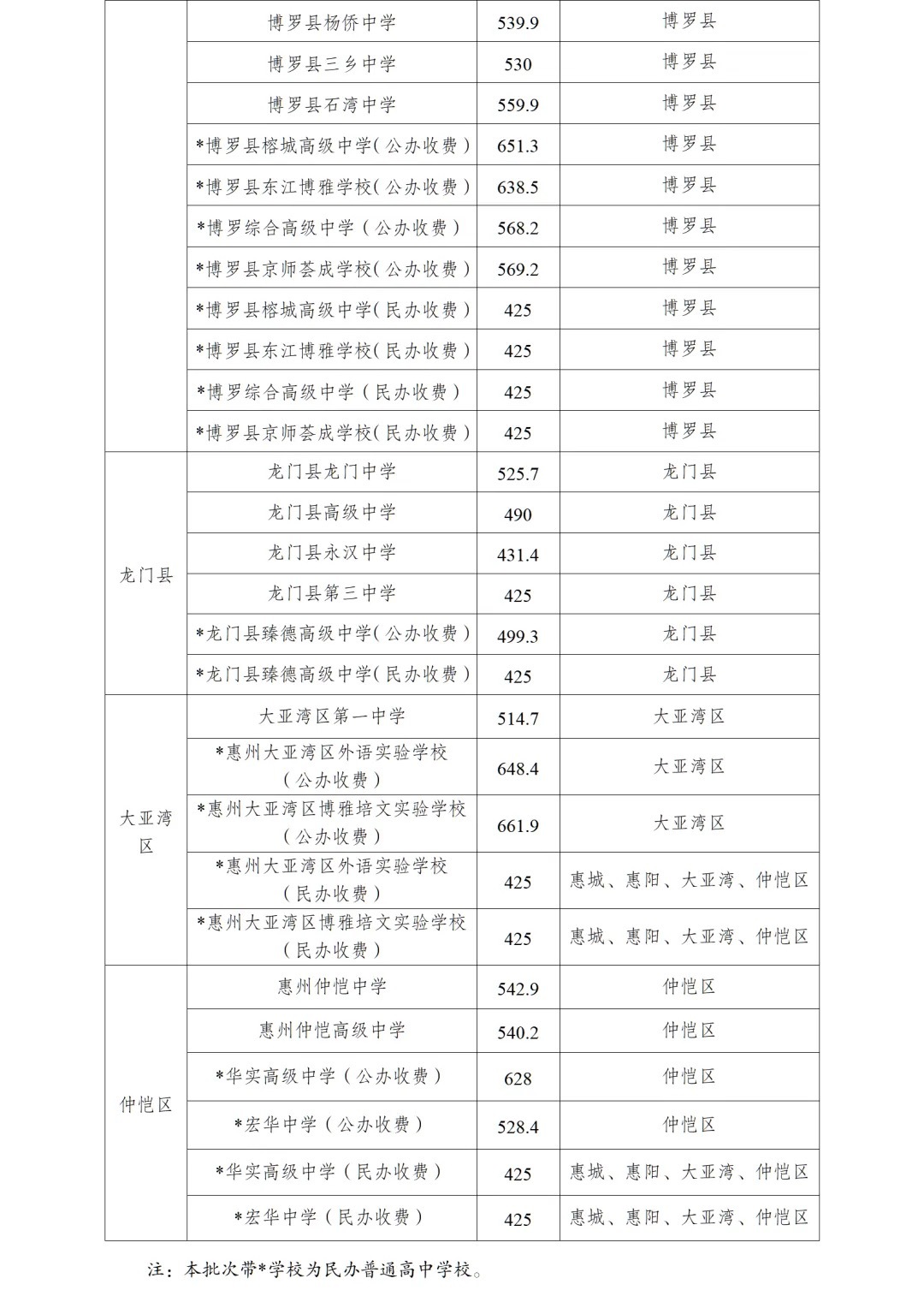据悉,在第一批普通高中学校中,惠州市第一中学在各县区的最低录取分数是669.6,惠州中学在各县区的最低录取分数是656.6。惠州市华罗庚中学国防班城区生录取分数线648.8,外招生录取分数线666.6;惠州市第八中学鸿蒙班城区生录取分数线648.2,外招生录取分数线660.1;惠州市实验中学讯飞智能班城区生录取分数线为653,外招生录取分数线671.4;惠州市东江高级中学奥林匹克信息学班城区生录取分数线为635.2,外招生录取分数线652.9;惠州市实验中学北校区青鹿智能班录取分数线648.3。惠东高级中学卓越班录取分数线为618.2;博罗中学强基弘毅班录取分数线为648.1;龙门中学惠州一中班录取分数线为649.1,惠州中学班录取分数线为625.6;龙门县高级中学强基班录取分数线为572.7;大亚湾区第一中学惠州一中班录取分数线为648.4;仲恺中学一中班录取分数线为601.7。