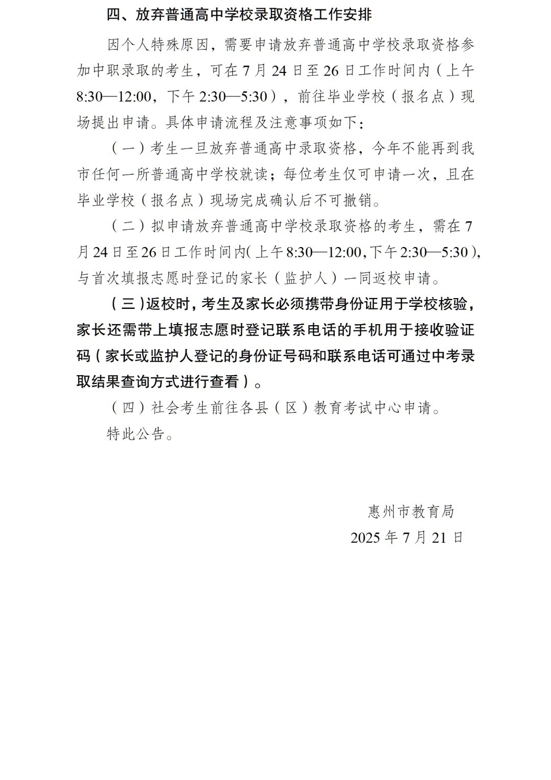 根据安排,因个人特殊原因,需要申请放弃普通高中录取资格参与中职录取的考生,可在7月24日至26日工作时间,前往毕业学校(报名点)现场提出申请。考生一旦放弃普通高中录取资格,今年不能再到惠州任何一所普通高中学校就读。