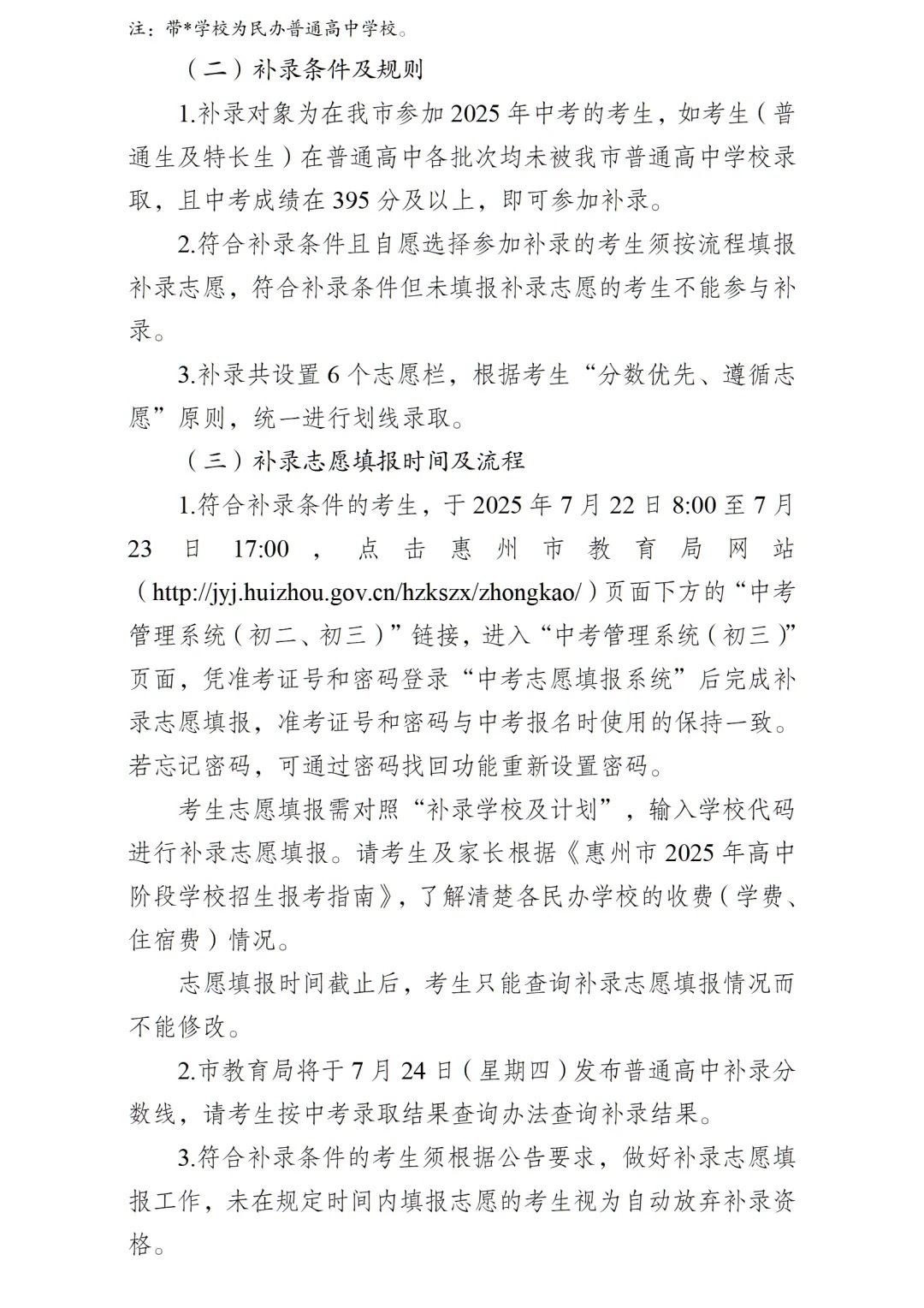 今年惠州共20所学校参与普通高中补录工作,补录计划超9000个,中考成绩在395分以上可参与补录。符合补录条件的考生,于7月22日8时至7月23日17时,点击惠州市教育局网站页面下方的“中考管理系统(初二、初三)”链接,进行补录志愿填报。