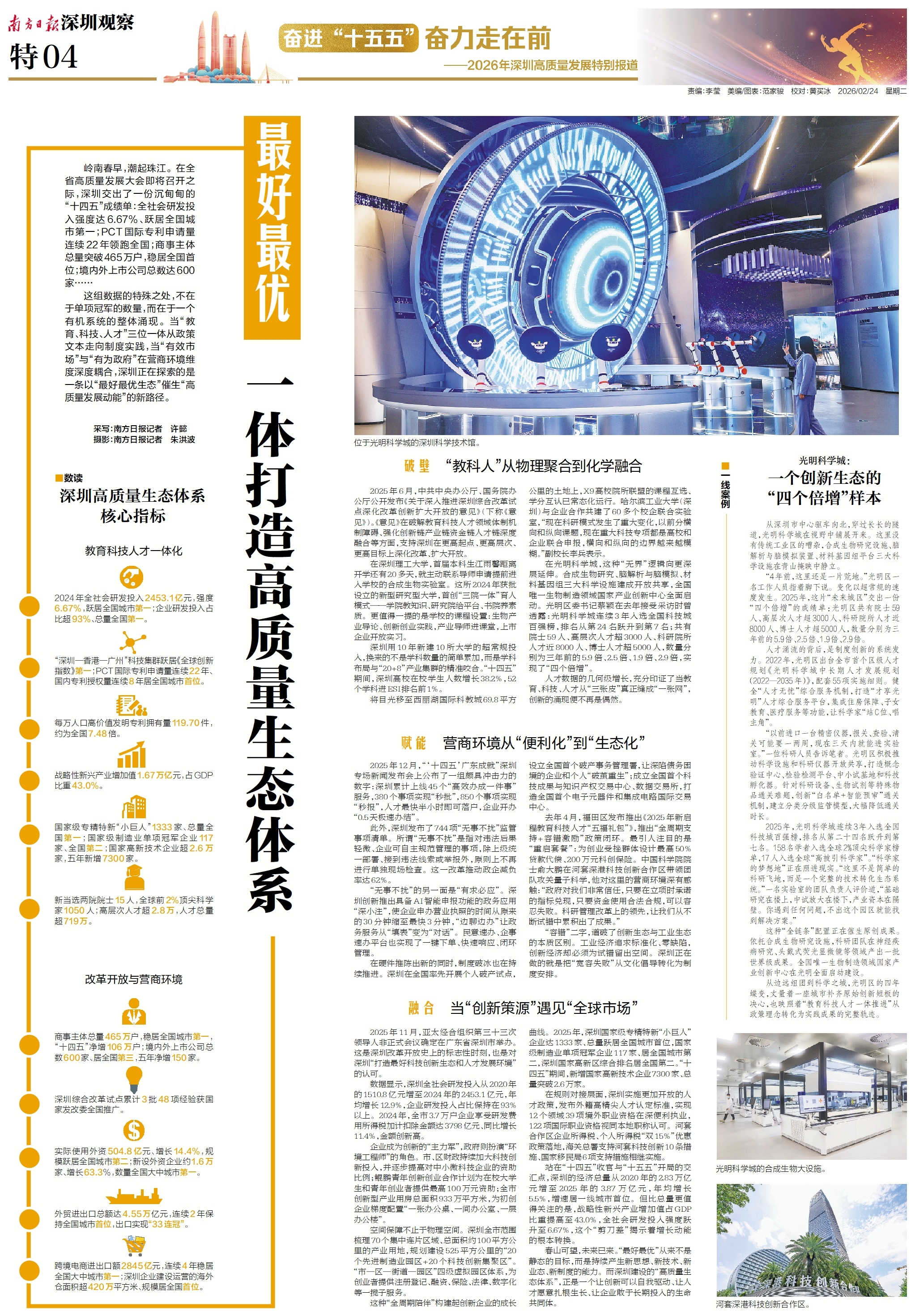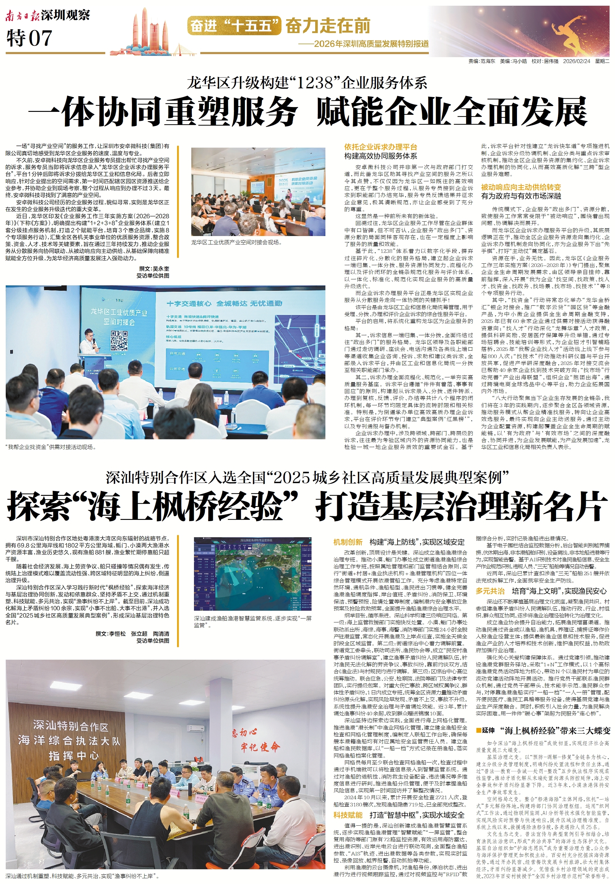 前海105项制度创新全国复制,河套六大国际性产业与标准组织落子,8所世界百强高校携科研项目入驻;深中通道一桥飞架,天堑变途;深圳都市圈日均跨市通勤180万人次,51条公交线穿梭如织;338项政务服务跨城通办,61项莞产、41项惠品融入“圳品”体系;深圳与海南战略协作,贸易额破两千亿;深圳企业出海e站通,链接全球46个园区——特区之大者,早已超越一城一域。