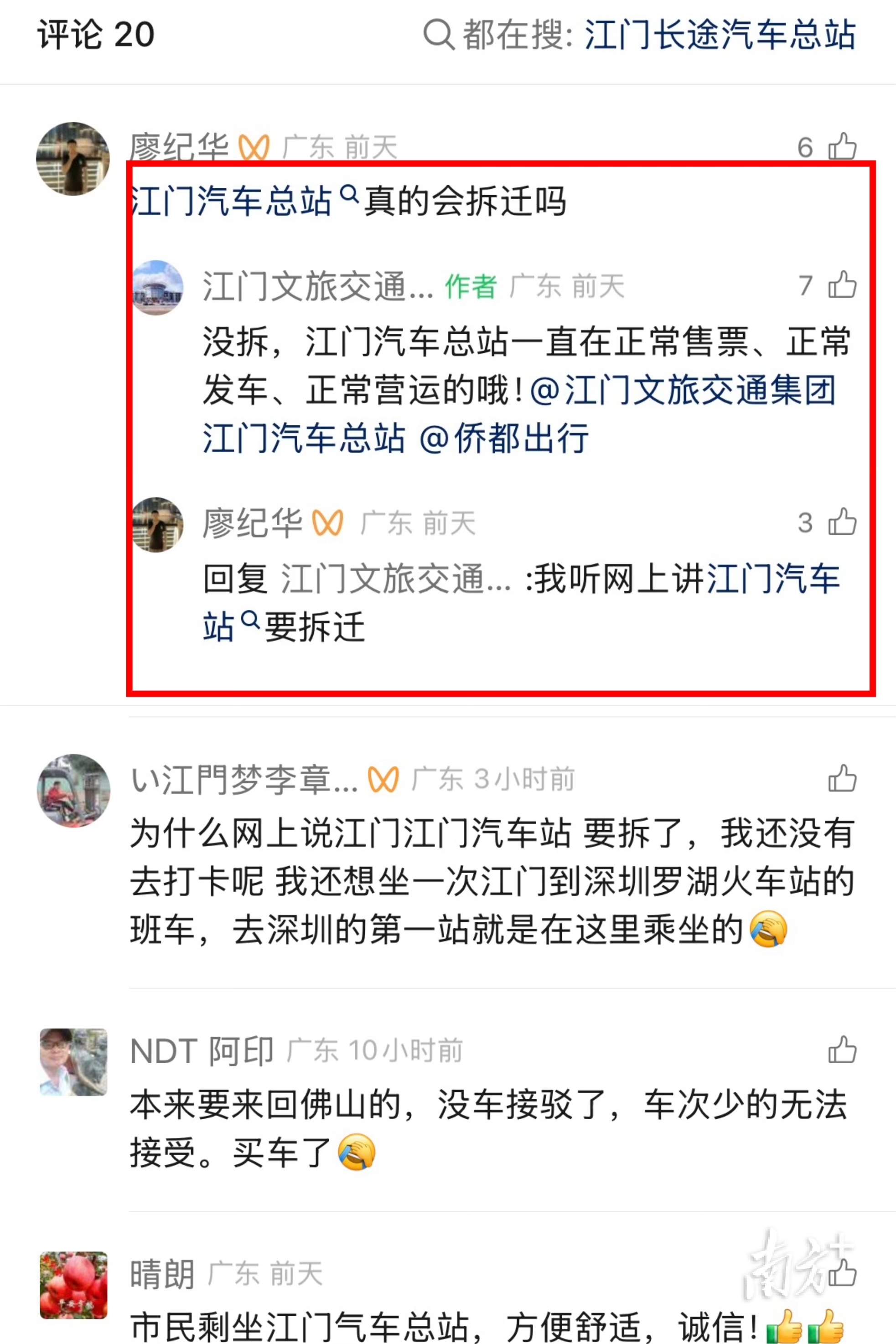 记者询问现场工作人员,“江门汽车总站是否要拆?”该工作人员表示“未收到相关消息,汽车站一直正常运营”。针对网传消息,江门汽车总站相关负责人表示,总站一直在正常售票、正常发车、正常营运,已通过官方微信公众号向市民和乘客作出回复解释。