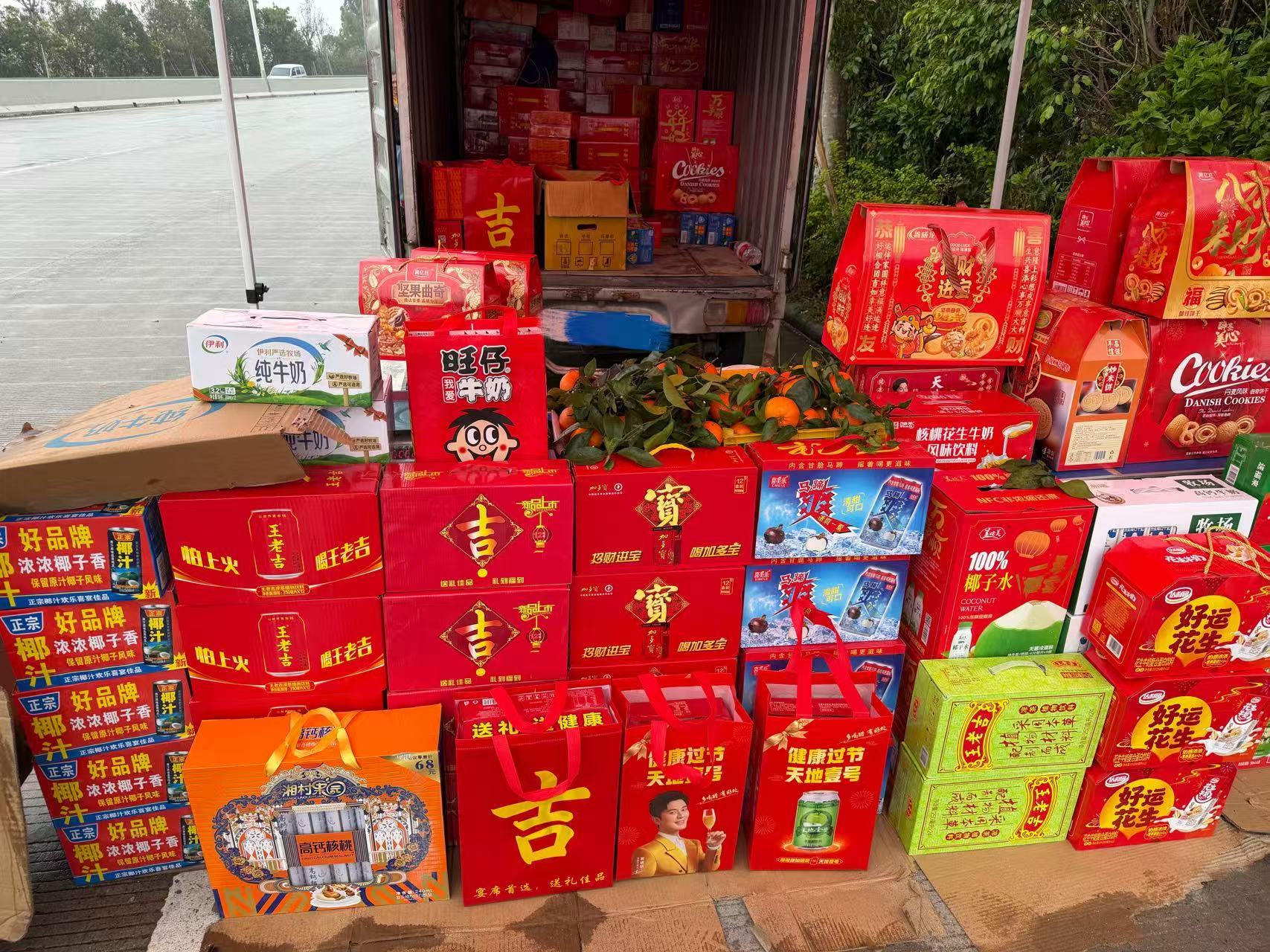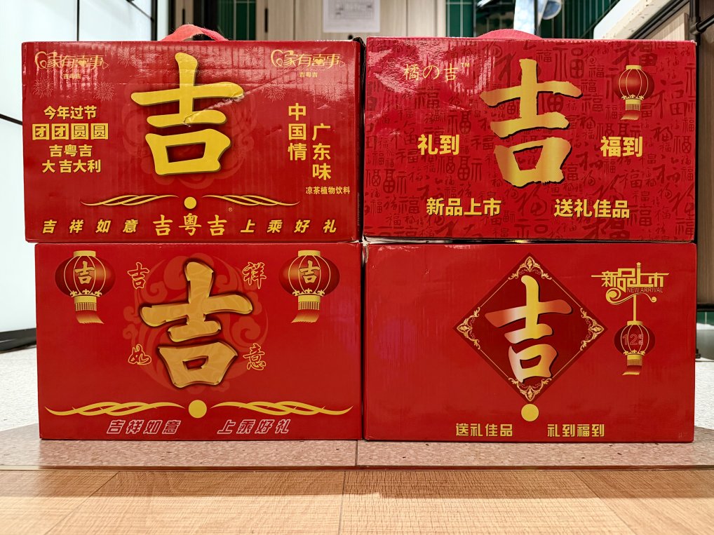 红底黄字、醒目之“吉”——如果你在粤西年例期间经过当地村口路边,很难不被那一箱箱红色的年货饮料吸引目光。