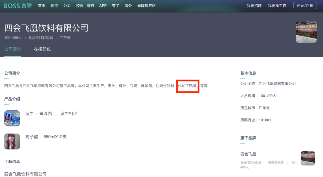 记者查询发现,“加致宝”广东凉茶的生产商为四会飞凰饮料有限公司。天眼查信息显示,该公司成立于2018年,位于广东省肇庆市,是一家以从事酒、饮料和精制茶制造业为主的企业,风险方面共有天眼风险信息14条、涉诉关系2条、开庭公告2条。而在BOSS直聘平台上,该公司简介写着:“本公司主要生产果汁、椰汁、豆奶、乳酸菌、功能性饮料,代加工贴牌等。”——代加工、贴牌,或许正是这类冒牌产品能够源源不断出现的源头。