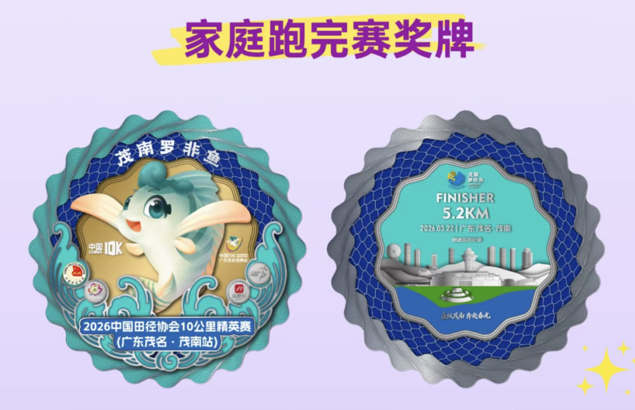 本次家庭跑项目特别设计了专属纪念奖牌。奖牌以春日绿意为主色调,融入了茂南罗非鱼、澄碧湖水、露天矿生态公园等地方元素,体现地域特色。作为中国田径协会A类认证赛事的完赛纪念,这块奖牌将成为参赛孩子的首枚国家级赛事奖牌。