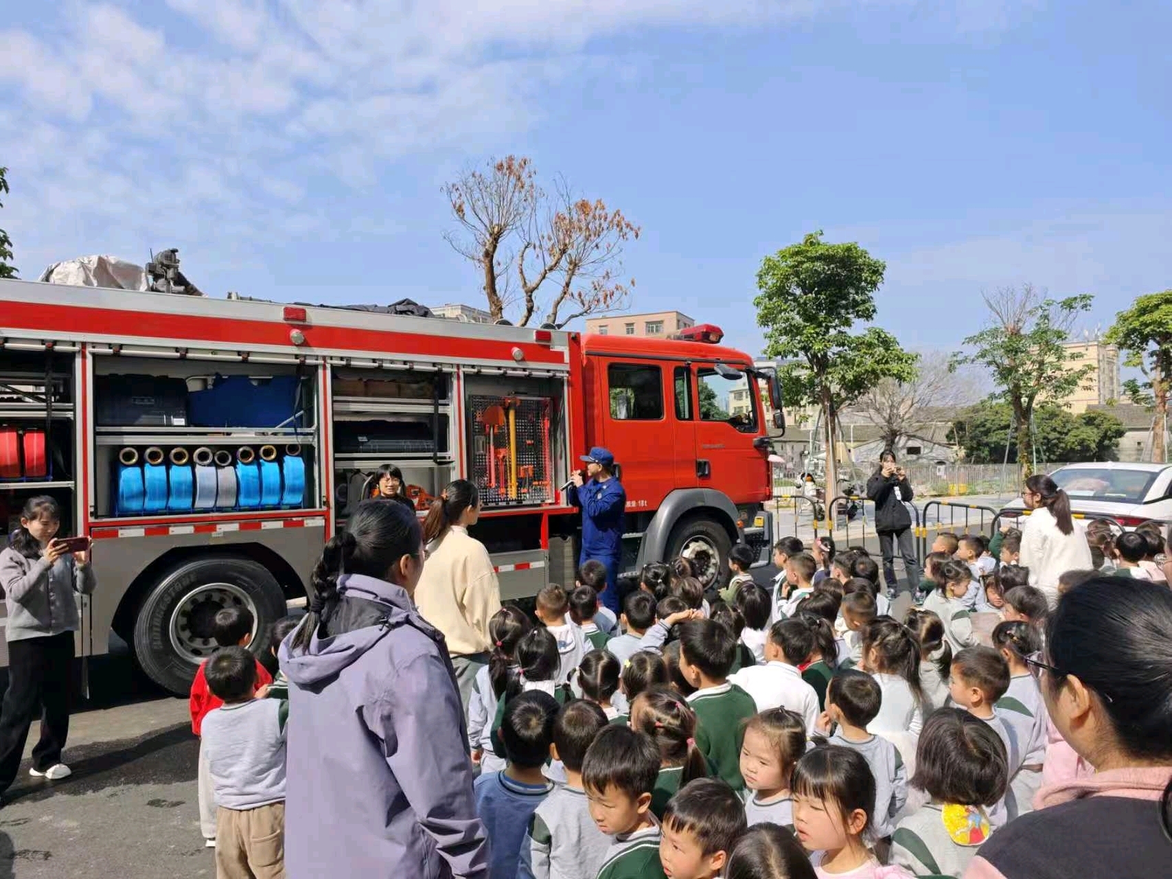 在盐田区,活动不仅面向学生,更注重夯实教职工的责任根基。消防宣讲员对教职工开展了系统培训,通过以案示警、以练促防,强化了教职工“消防安全、人人有责”的主体意识。此外,坪山大队通过消防车辆与器材装备展示,学生们近距离参观了消防车,踊跃参与消防服试穿、头盔佩戴,让消防安全的种子在稚嫩心田悄然扎根。