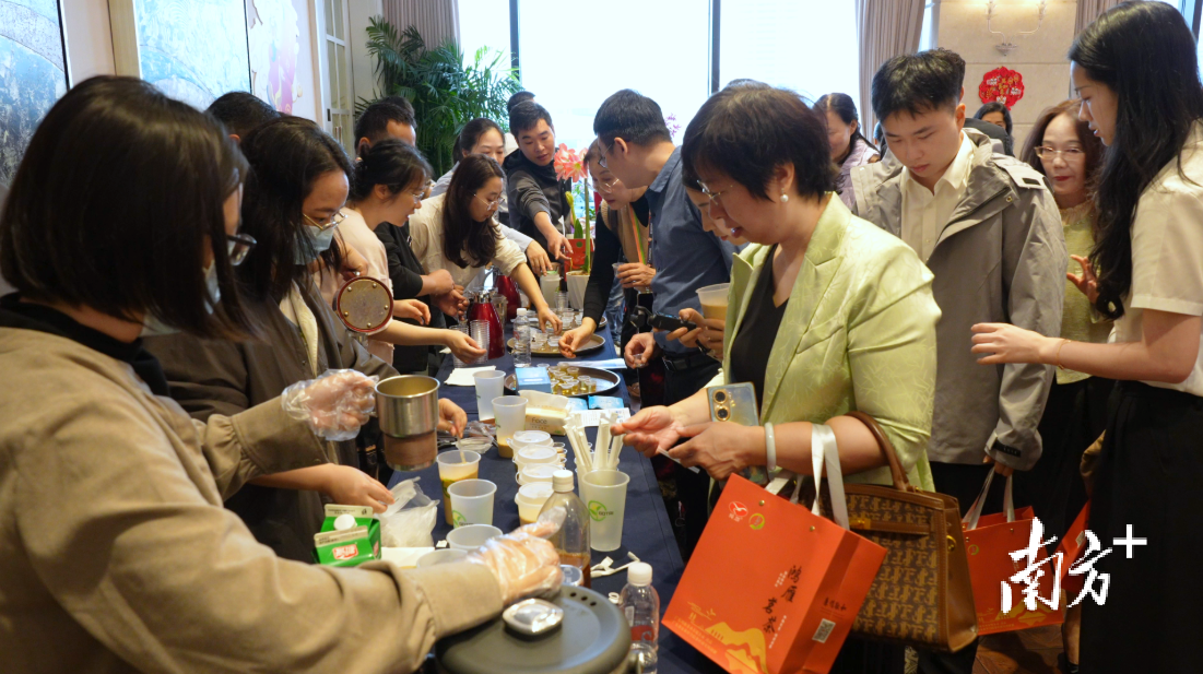 “广货行天下 品茶与看花”产品推介会现场,一杯杯茶香浓郁的奶茶被递到嘉宾手中。舞台上,茶艺师熟练地展示“英红九号”冲泡技艺,金毫茶汤色橙红明亮;专业插花表演将湾区春色与岭南花艺美学相融,引得嘉宾纷纷举起手机记录。