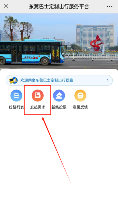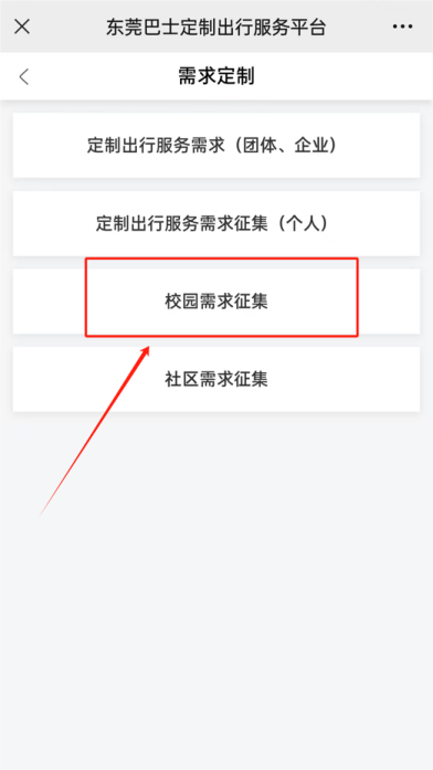 1. 点击下方二维码进入小程序 → 选择“智慧出行”→“定制公交”→ 在平台首页点击“发起需求”→ 选择“校园需求征集”→ 找到你的学校,填写出行信息。