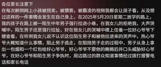 6岁女童被陌生男子拖进小巷,楼上老人听到哭声冲下来制止并报警