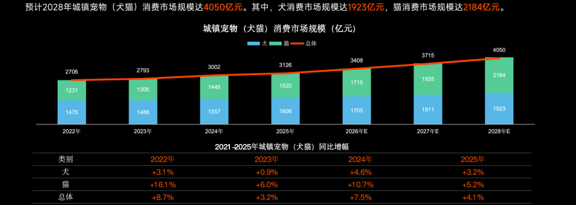 根据《2026年中国宠物行业白皮书(消费报告)》,宠物消费市场正展现出强劲的增长势头和巨大的发展空间。2025年中国城镇宠物(犬猫)消费市场规模已达3126亿元,同比增长4.1%,并预计将在2028年增长至4050亿元。其中,宠物食品作为最核心的消费类别,占据了53.7%的市场份额,主粮、零食、营养品等细分领域均呈现小幅上升趋势。
