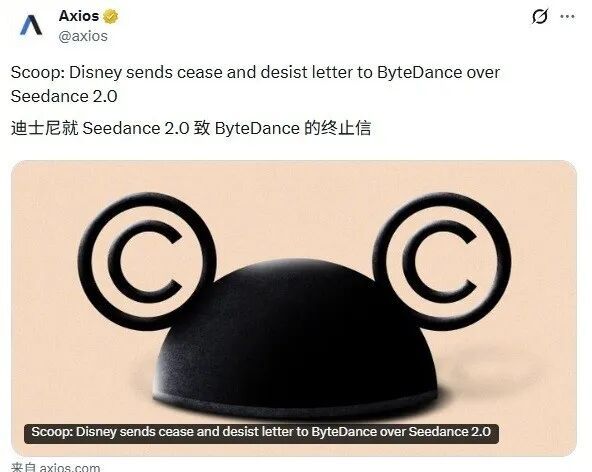 根据Axios获得的信件副本,华特迪士尼公司已于当地时间周五向字节跳动发函,指控对方在训练和开发Seedance 2.0模型时未经许可使用迪士尼作品,要求字节跳动“停止侵权且不得再犯”。