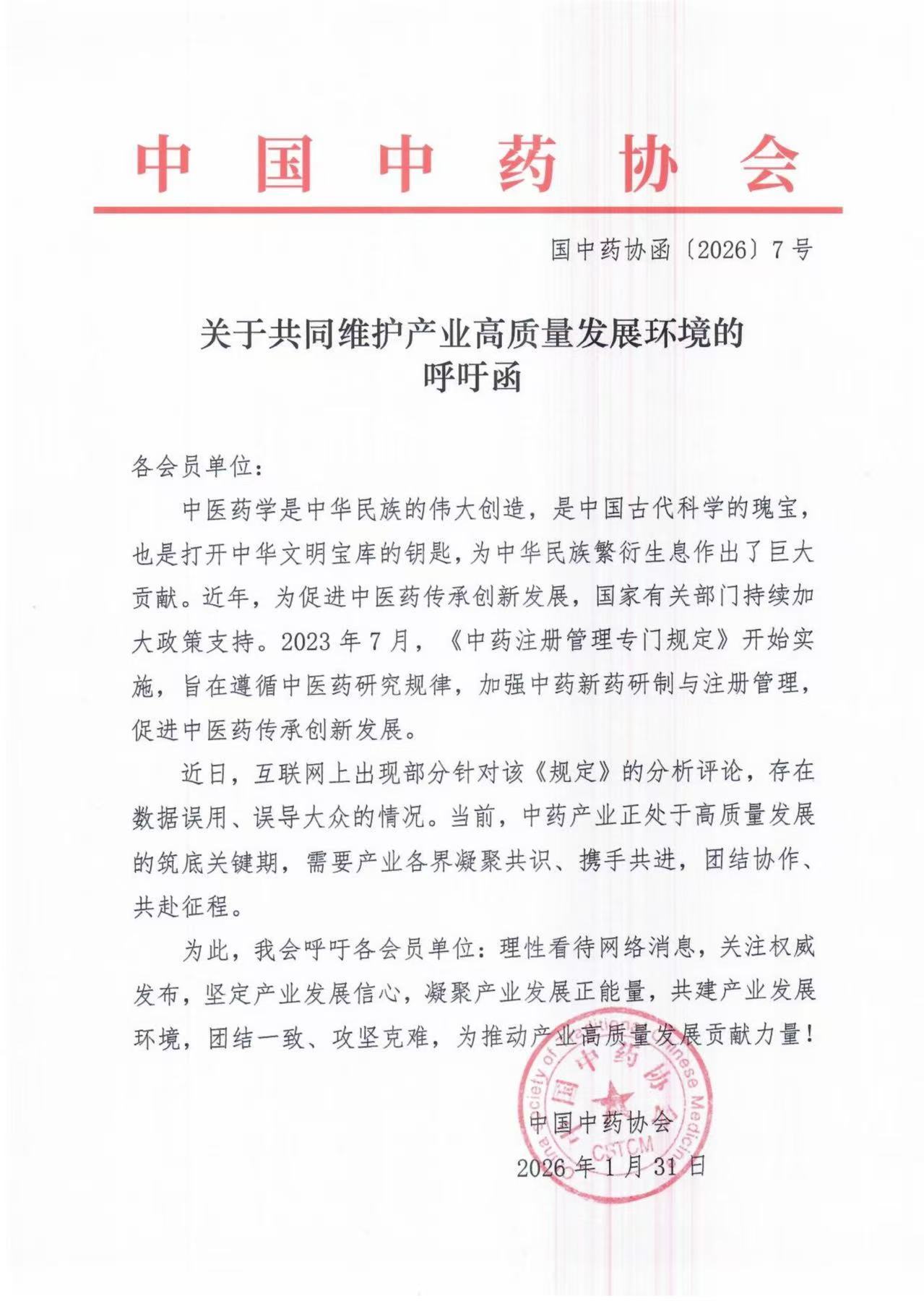 2月2日,中国中药协会发布《关于共同维护产业高质量发展环境的呼吁函》,文中指出,近日互联网上出现部分针对《中药注册管理专门规定》的分析评论,“存在数据误用、误导大众的情况”。