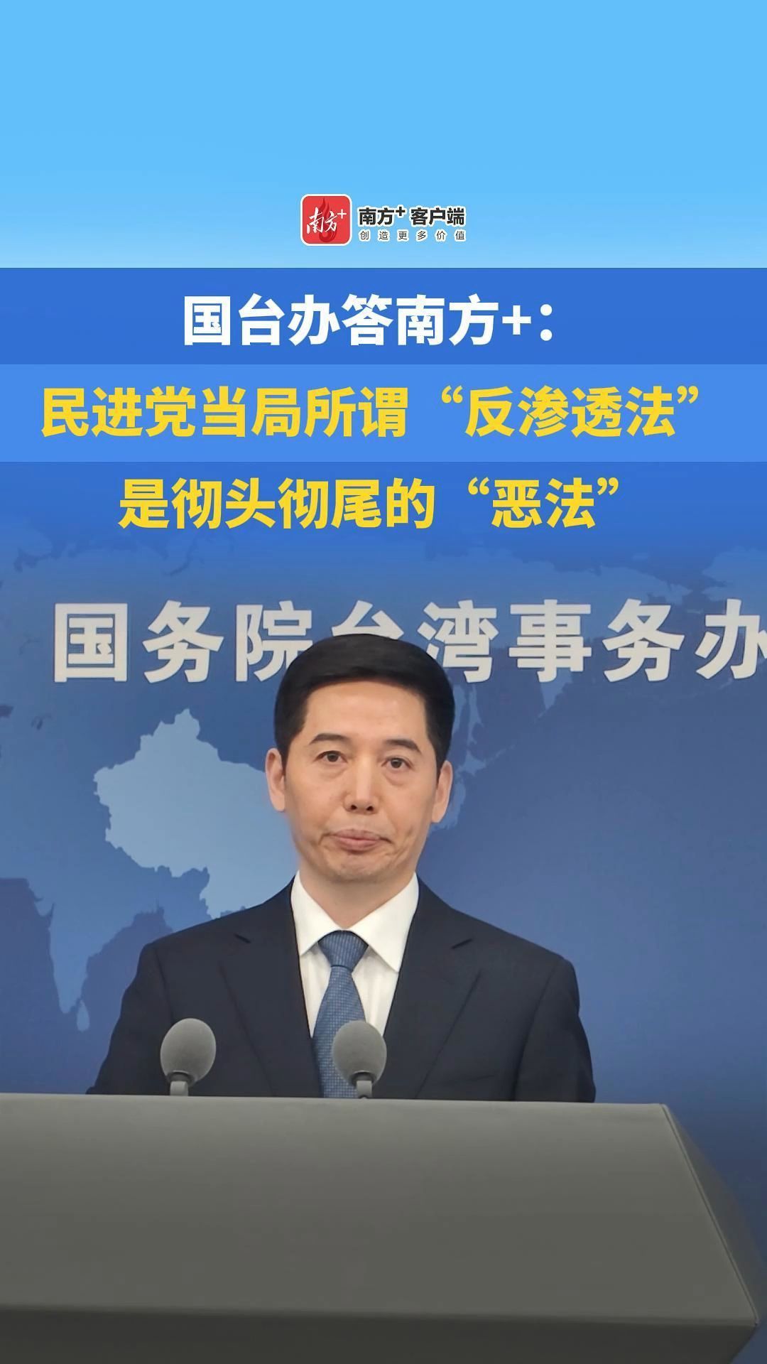 国台办答南方+:民进党当局所谓“反渗透法”是彻头彻尾的“恶法”