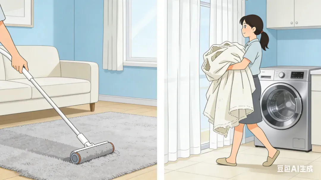 沙发、窗帘、地毯:沙发缝用粘毛器滚三圈,比吸尘器还管用!窗帘直接丢洗衣机加入除螨洗衣液或两勺白醋,消毒又除味。
