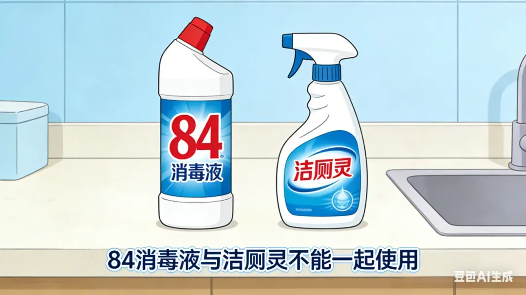 ⚠️绝对禁止:84消毒液(含氯)和洁厕灵(通常含酸)绝不能混合!会产生剧毒氯气,严重可致命!