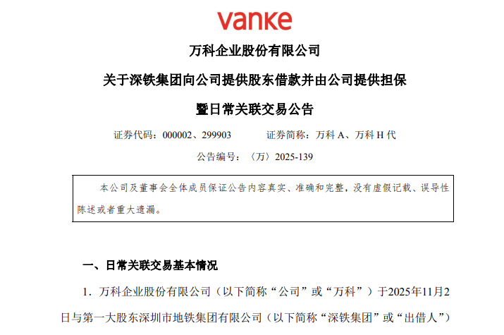 11月2日,万科宣布与第一大股东深圳市地铁集团有限公司(简称“深铁集团”)签署《关于股东借款及资产担保的框架协议》,涉及借款额度不超过220亿元。用于偿还公司在公开市场发行的债券本息以及经深铁集团同意的指定借款利息。