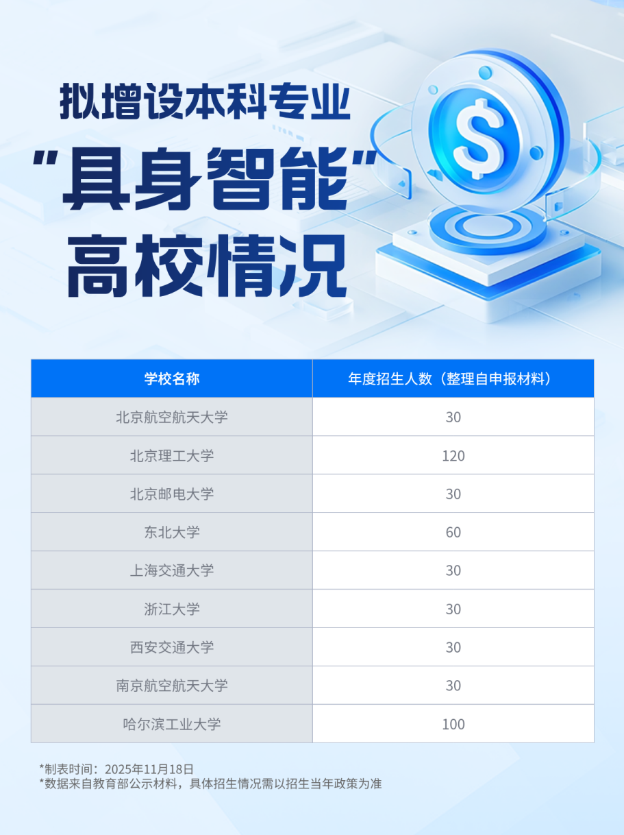 今年8月,教育部发布的2025年度普通高等学校本科专业申报材料公示中,南京航空航天大学拟增设具身智能专业,哈尔滨工业大学拟增设具身智能工程专业,顶尖高校集体发力的态势已逐渐形成。