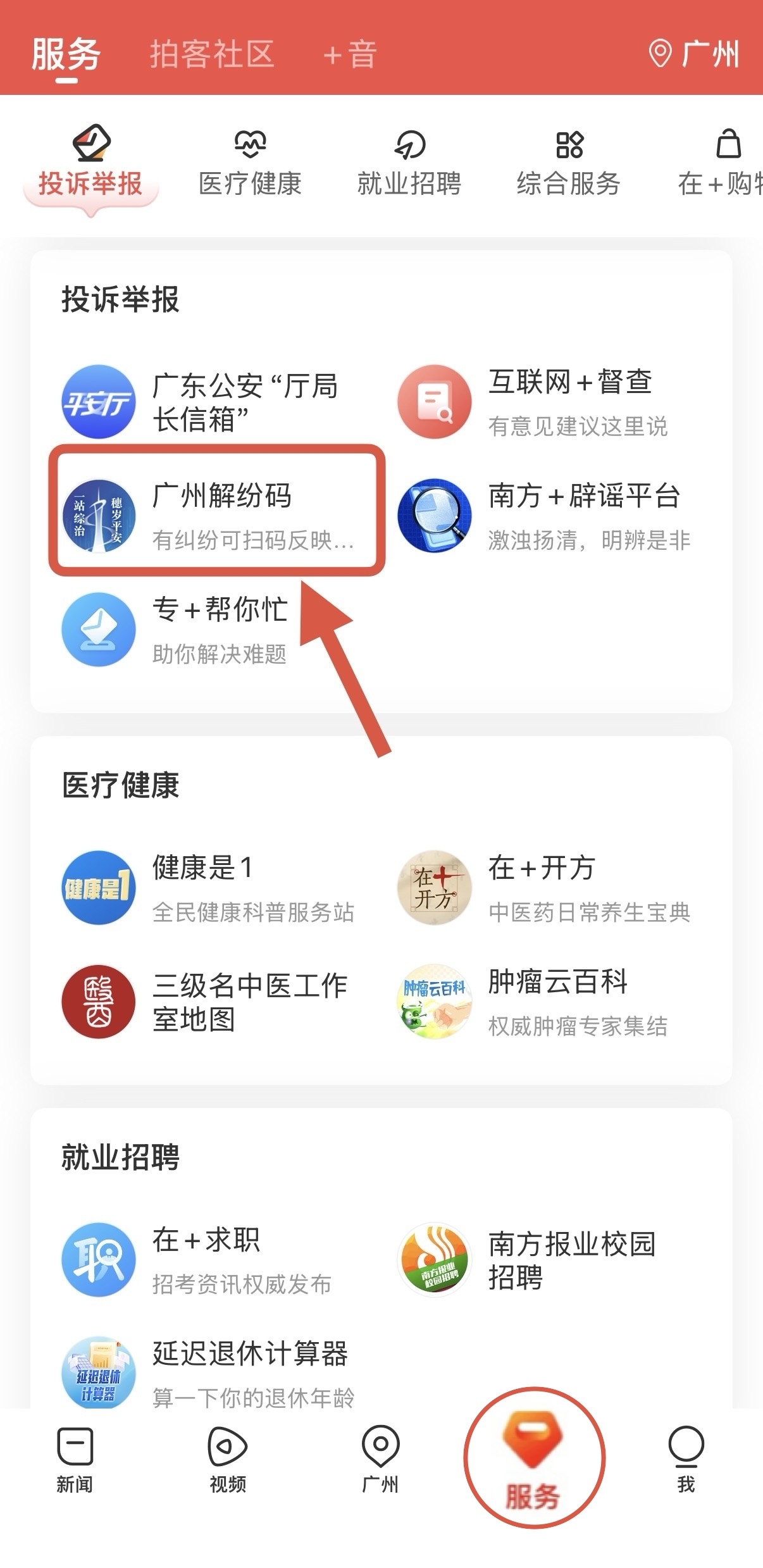 步骤二:在“服务”板块中找到“投诉举报”专区,即可看到“广州解纷码”。