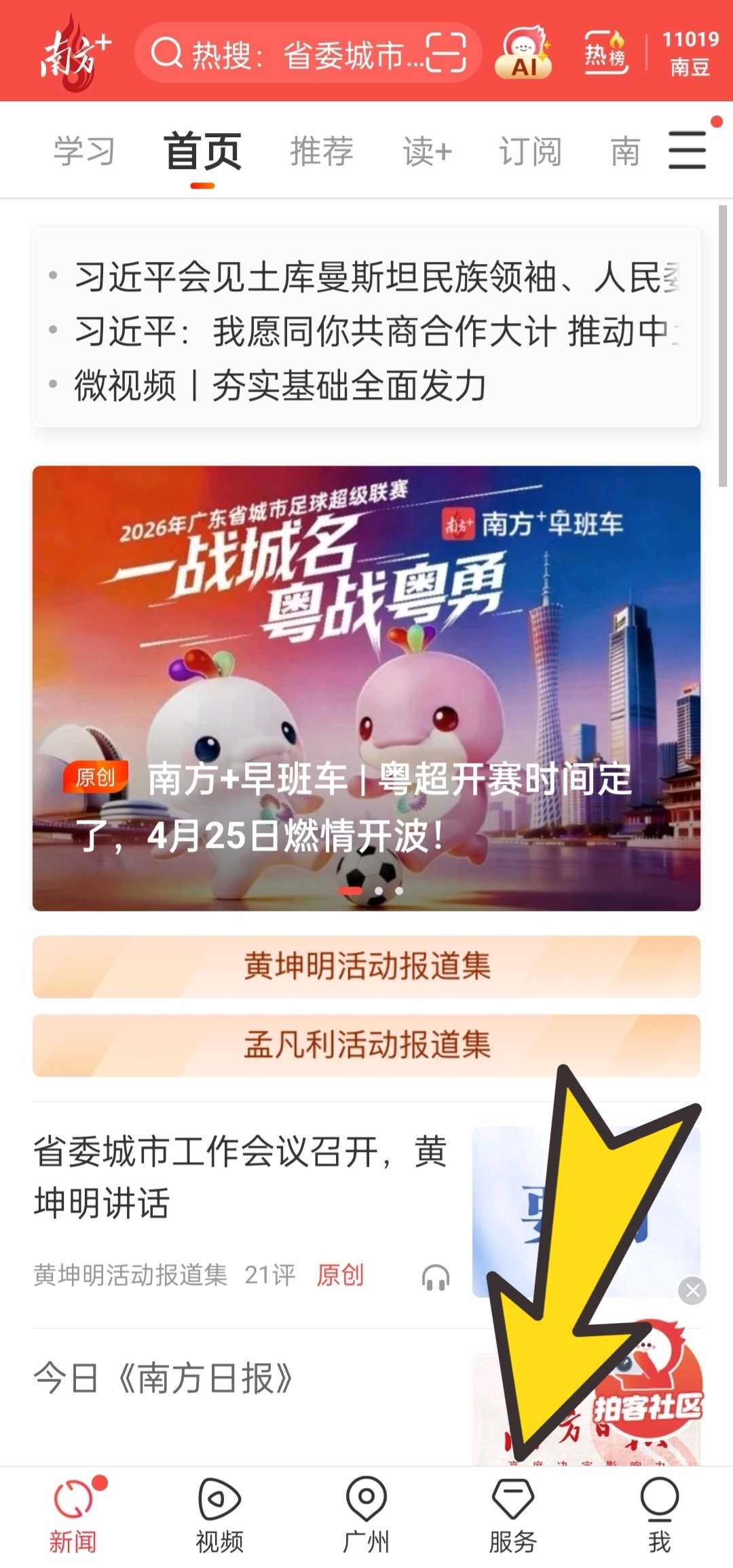 步骤一:打开南方+客户端,在“首页”下方找到“服务”板块。