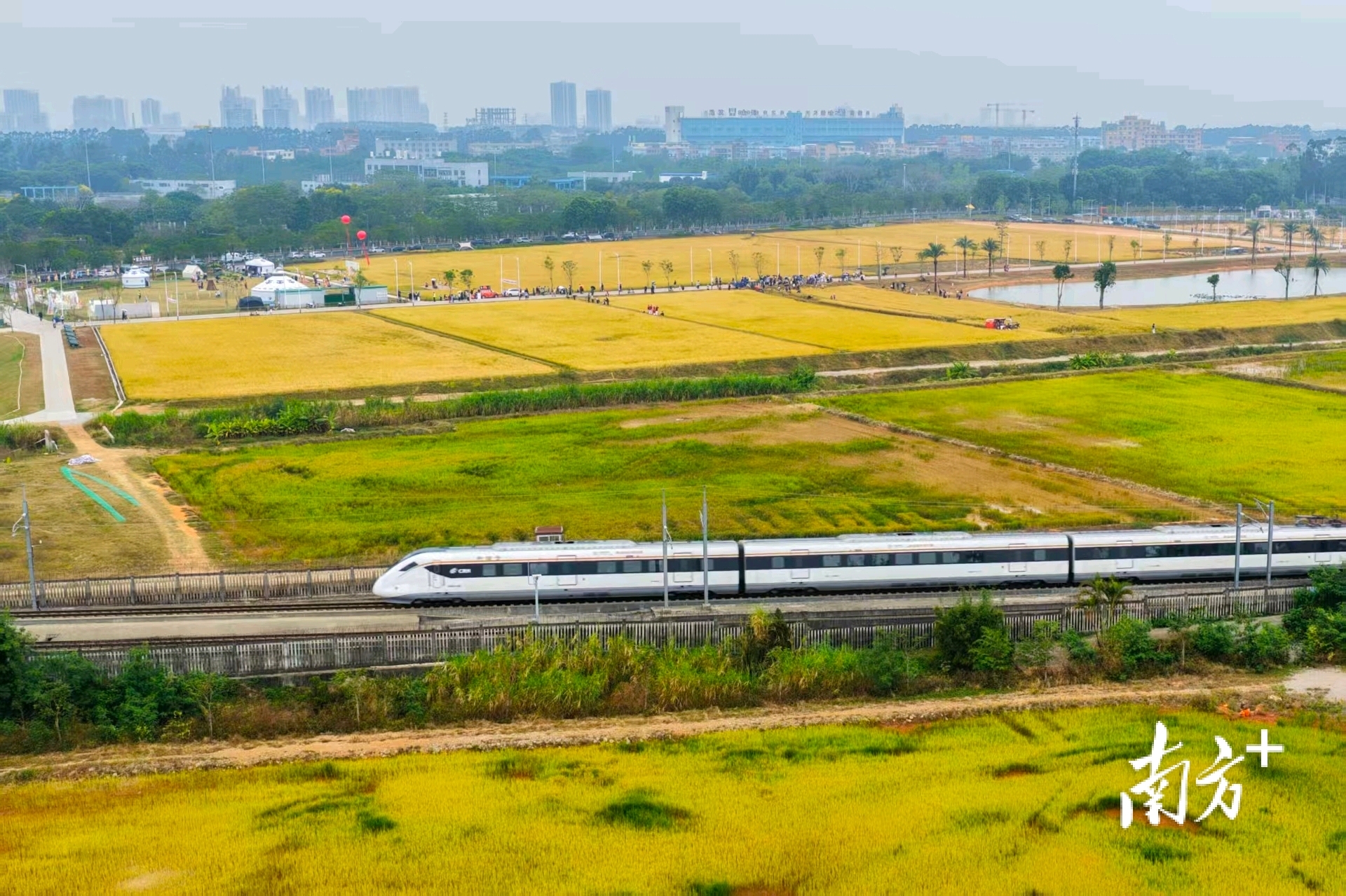 广惠城际列车在稻田旁呼啸而过,夾杂着收割机的轰鸣,惊起三五只白鹭,从水塘边掠过,飞向一旁的东莞运河……