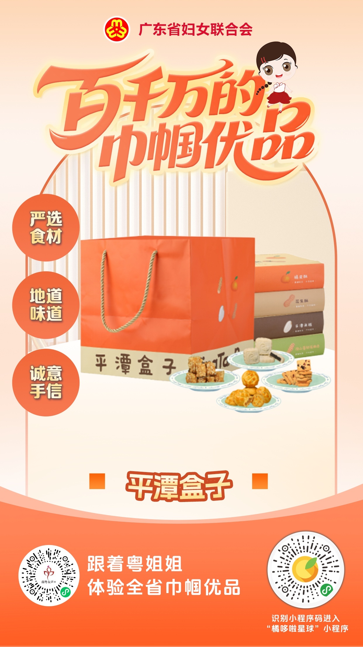 【惠州 巾帼优品:平潭盒子】惠州平潭镇的沙质土壤孕育出清甜粉糯的淮山、鲜亮多汁的柑橘、温润粘米和饱满花生。大橘农业严选这些地道食材,制成“平潭盒子”点心礼盒,将田园风味化作分享家乡生活的诚意手信,传递“从田间到舌尖”的温暖故事。创始人欧娜参与国家级重点研发计划,并任广东省柑橘产业技术体系创新团队示范实验站站长,承接广东省农业科学院果树研究所专家的实验示范任务,建立柑橘种植示范基地。她推广现代种植技术,帮助农户脱贫创收,还引入“农业+科技+艺术”理念,让田园生活焕发新活力。扫描海报右侧小程序码即可进入官方小程序。【开栏的话】今年是“百县千镇万村高质量发展工程”实现三年初见成效目标的重要节点。“百千万工程”实施以来,广大粤姐姐积极投身县域经济主阵地、绿美生态第一线、产业升级最前沿,以科技赋能现代农业发展,以创意激活农文旅产业融合,以智造推动特色产业升级,打造了一批独具特色的美食、美居与美物,助力广东县域经济迸发新活力、助推和美乡村绽放新光彩。广东省妇联联合南方日报、南方+、南方网推出“百千万的巾帼优品”栏目,以轻海报形式推介全省各地“巾帼优品”,助力消费、赋能发展。和粤姐姐一起看见她力量,支持她创造!