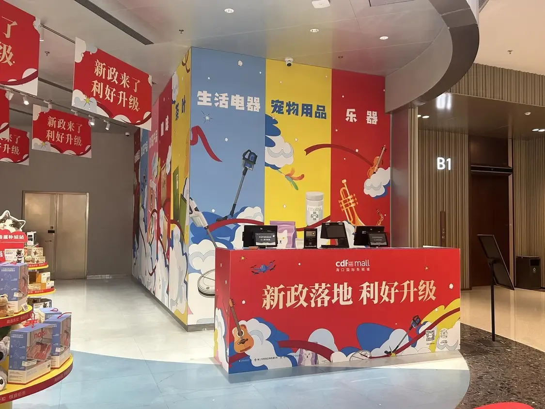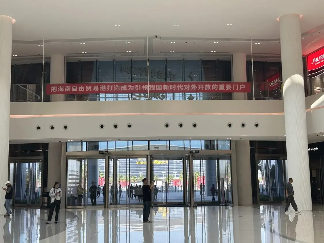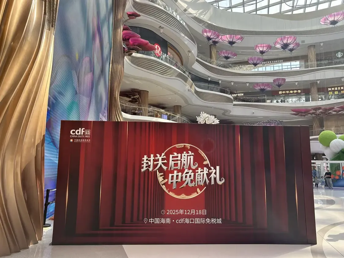 走在免税城,随处都能看到“新政落地、利好升级”、“封关启航、中免献礼”的横幅和标语,电子屏上的倒计时已经停止。来自国内外的游客聚集在一楼,等待在“封关启航”的活动展板前合影。